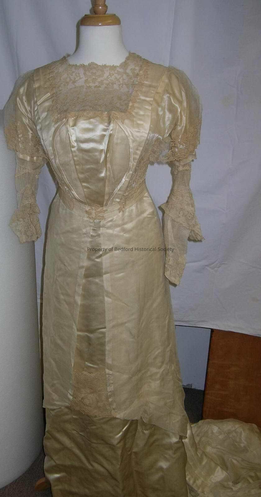 Wedding gown, circa 1910, ivory overlaid with pale beige sheer silk, Carrickmacross shamrock lace applique used at the yoke in a kind of fichu treatment forming cap sleeves over long sleeves and cuffs of the long sleeves.