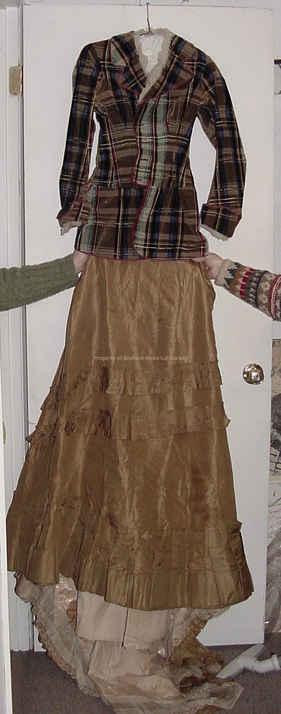 Silk and velvety two piece gown, mustard silk skirt with pleated ruffle and long train, trimmed with linen and lace. Mustard and aqua velvet plaid jacket, styled as riding jacket, with pleated trim and deep pink satin piping. Some machine sewing and heavy starching in skirt lining.