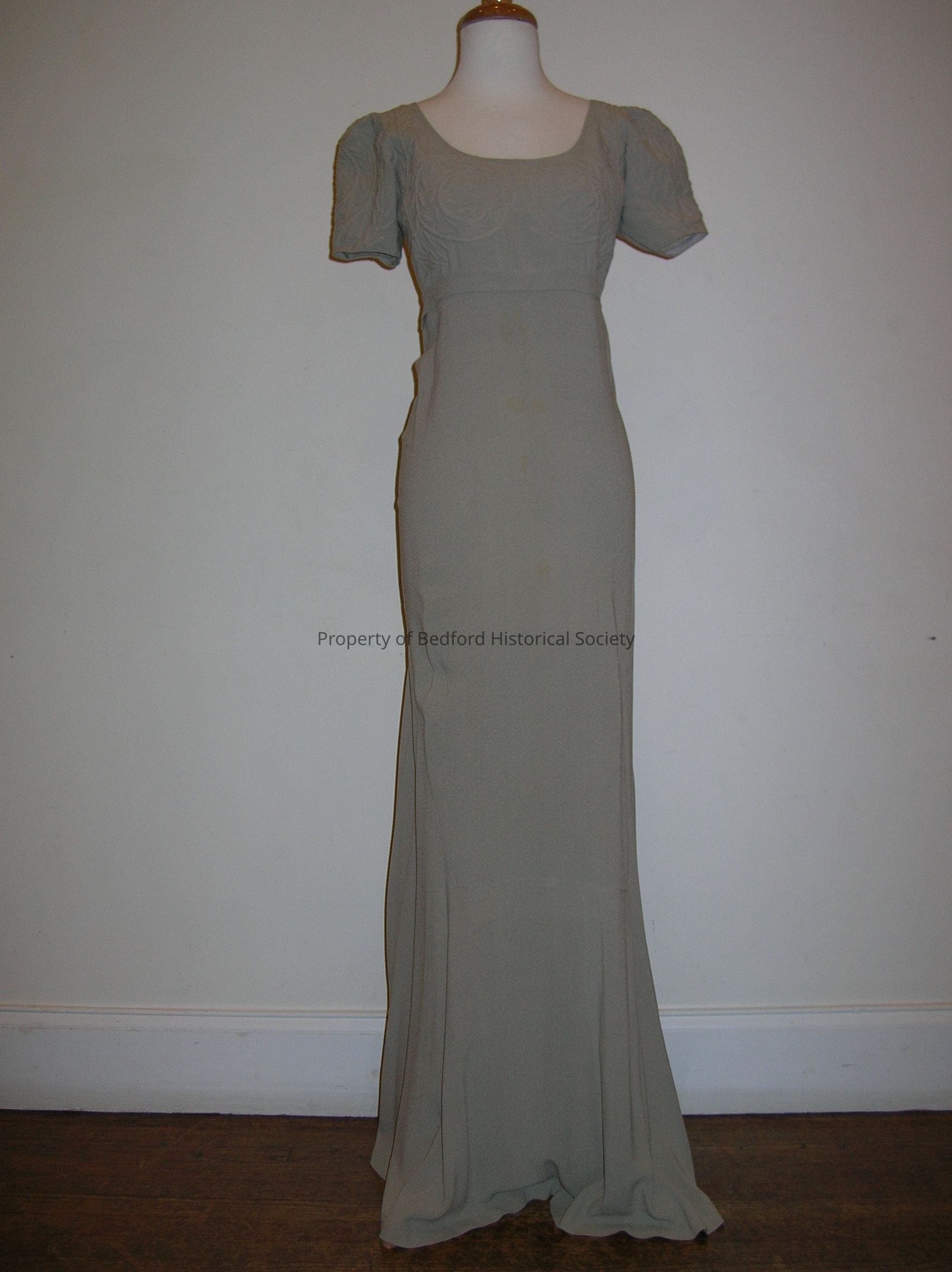 Grey silk floor length evening gown with short puff sleeves, boat neck and a ribbed patterned bust.