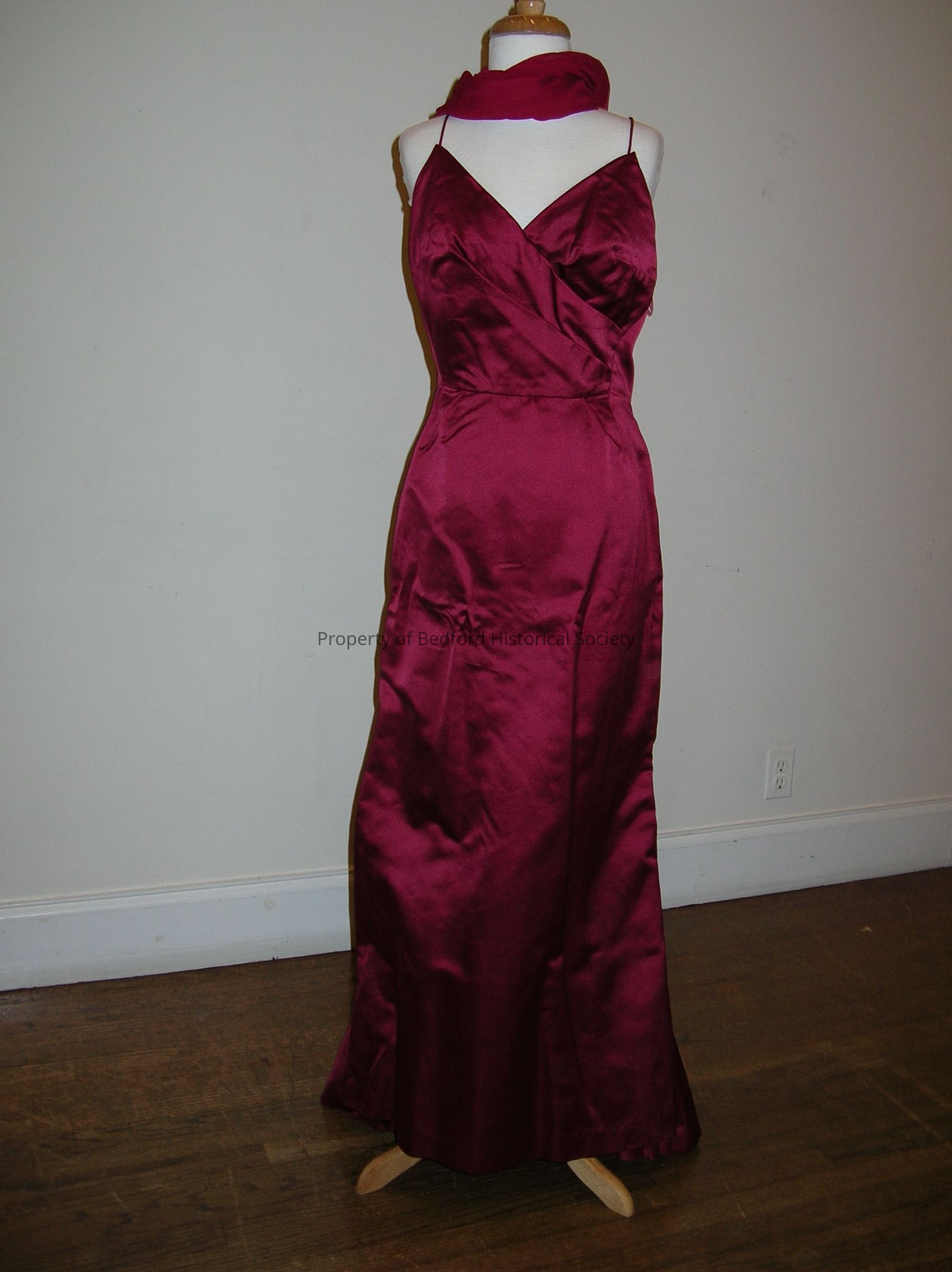 Red floor length evening gown with thin straps and v neck, a small train and thin silk scarf.