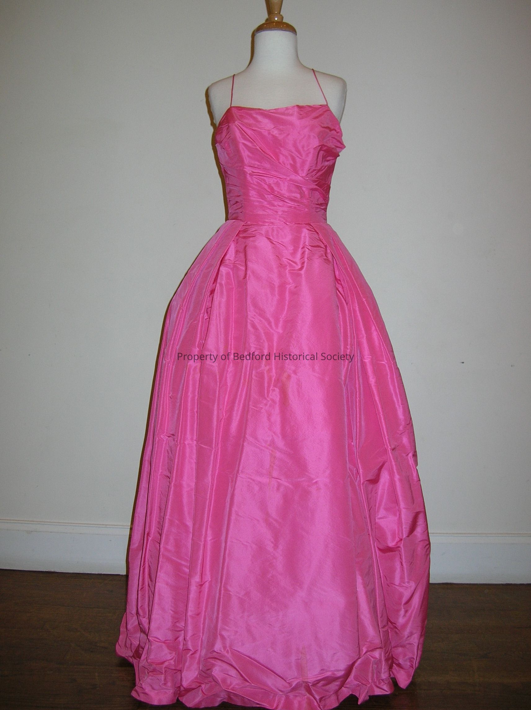 Pink Bonwit Teller evening gown with bow at back waist. Second label reads "Minuet Formals by Mollie Stone." spaghetti straps. staining on center front skirt and underarms. synthetic taffeta. 1950s. 27" waist; 57" long not including straps.