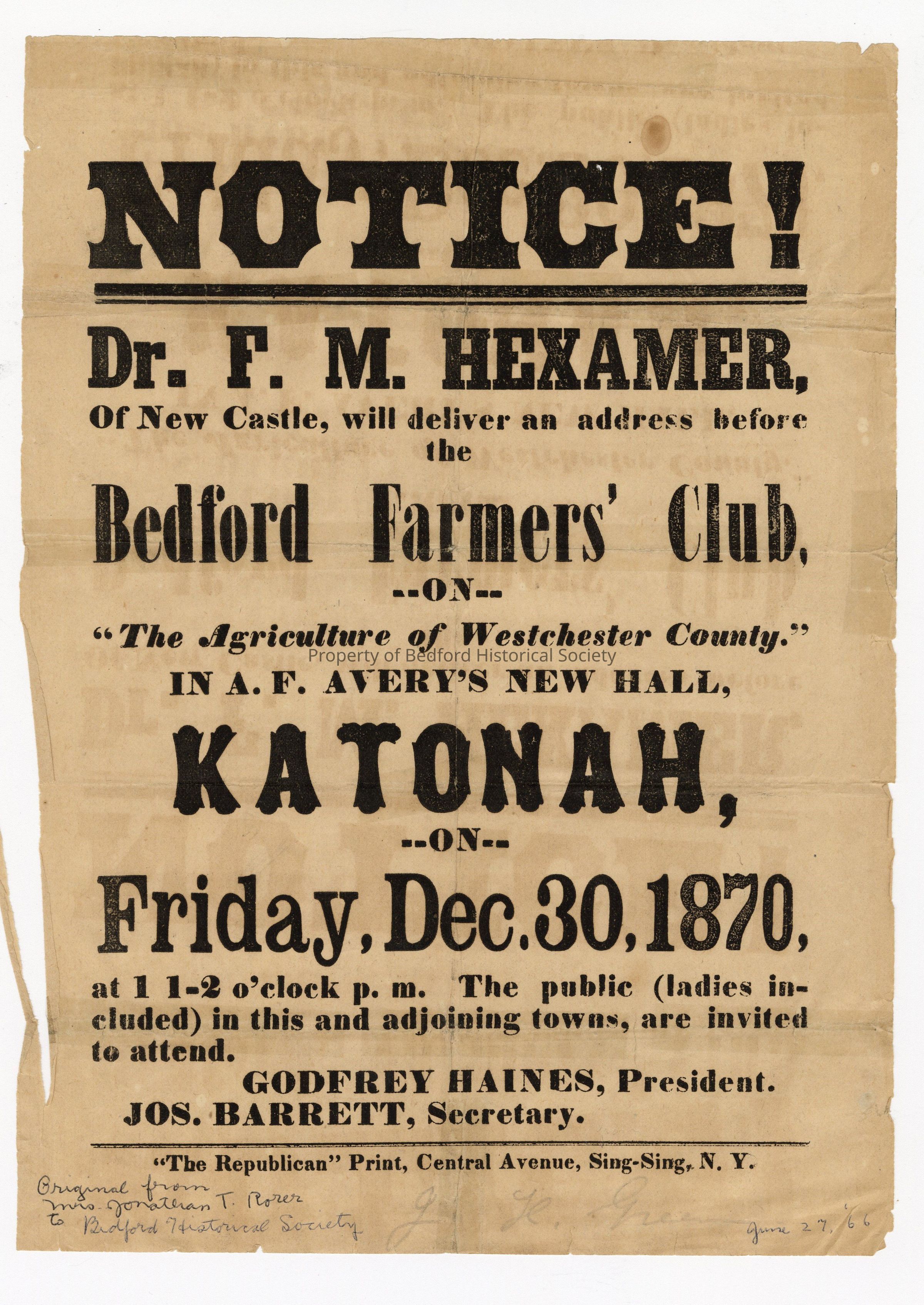 Handbill for a speech given for the Bedford Farmers' Club