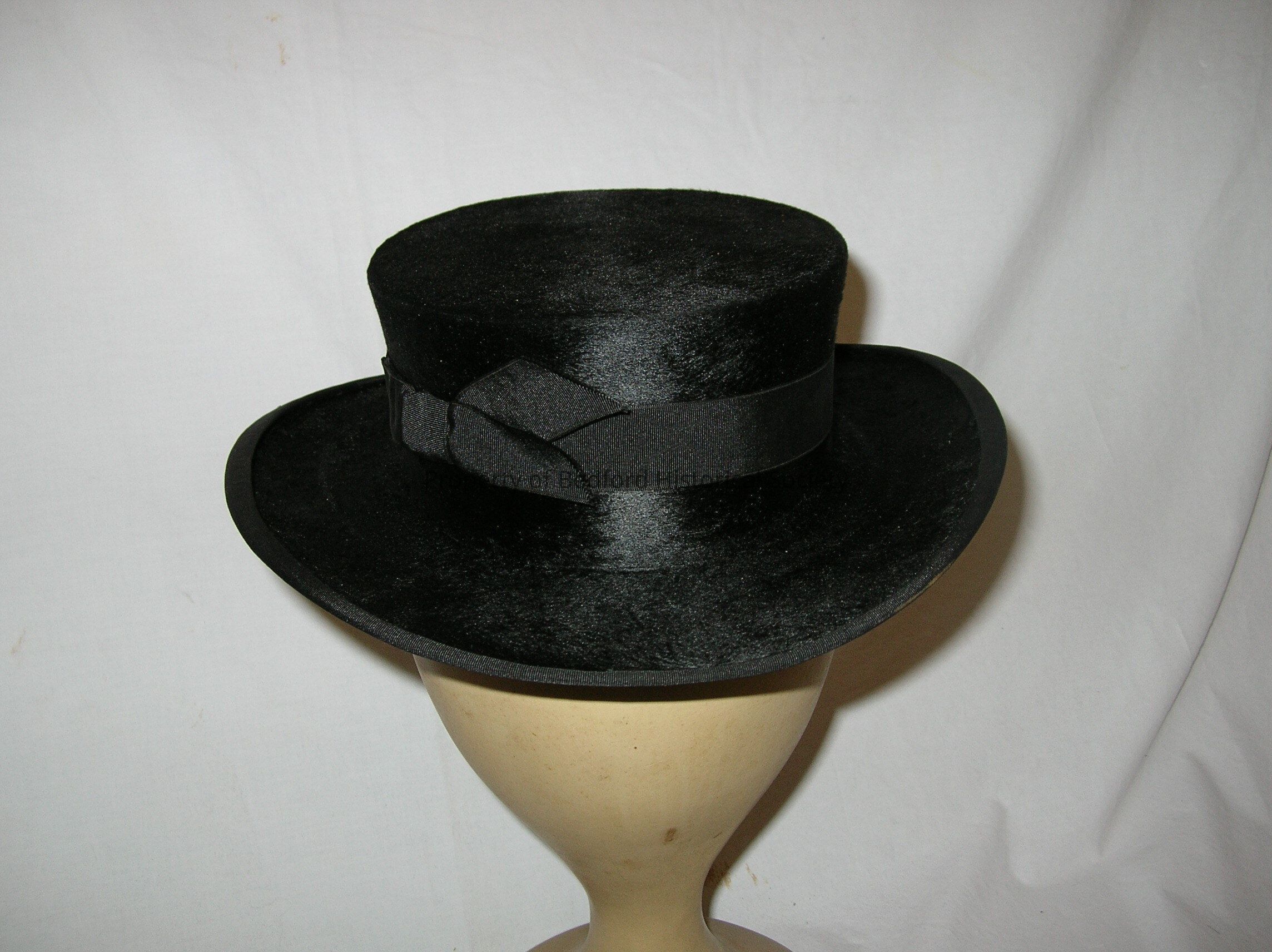 Black beaver(?) hat with black satin ribbon. Label reads, Herbert Johnson, (Bond Street) Ltd. New Bond St. London, W.