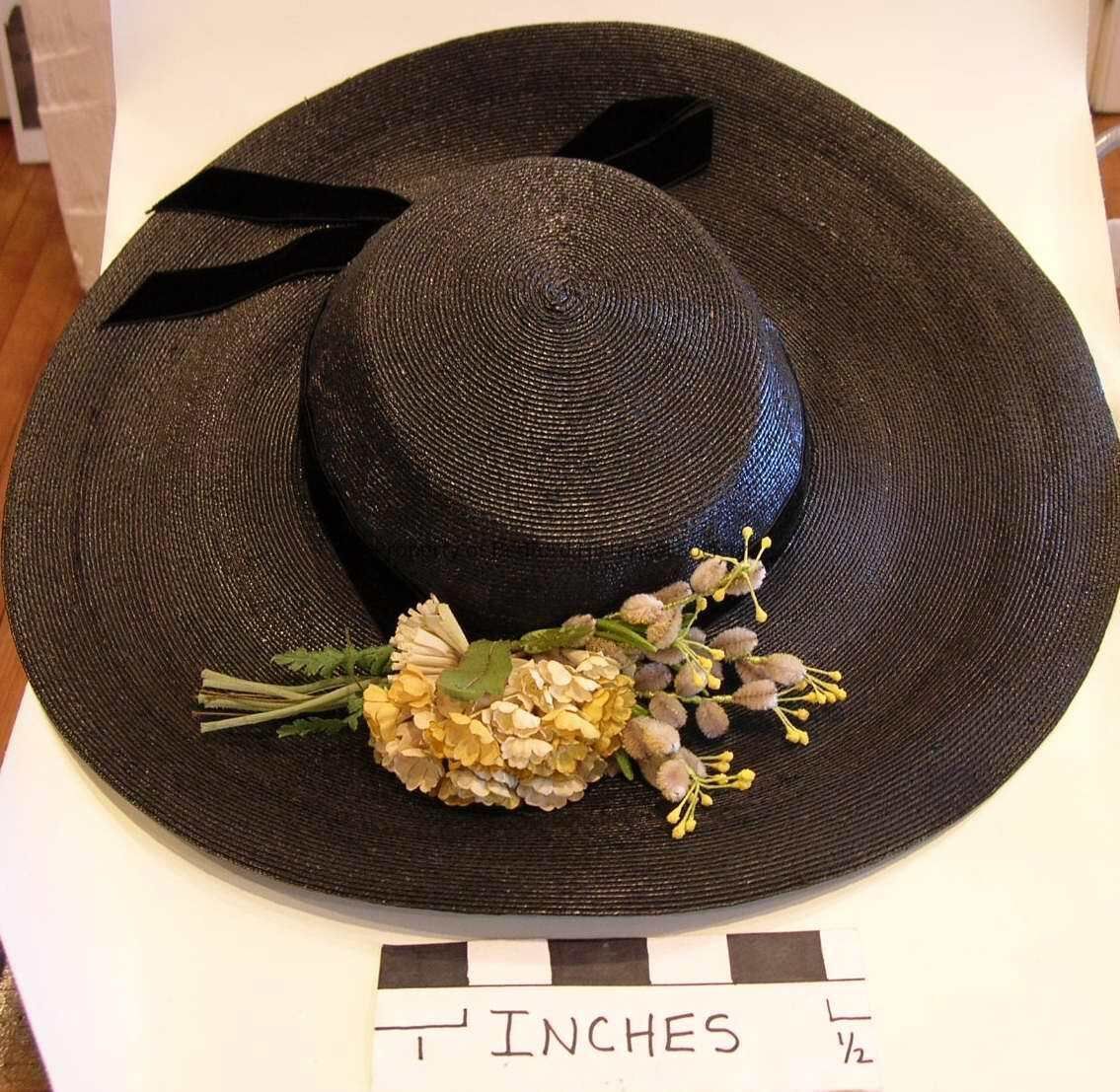 Black straw hat with artificial flowers and velvet ribbon found in 2021 in maroon Marguerite Yvonne Millinary Creations round large hat box. Pencil inscription on hat box label reads "Chappell"