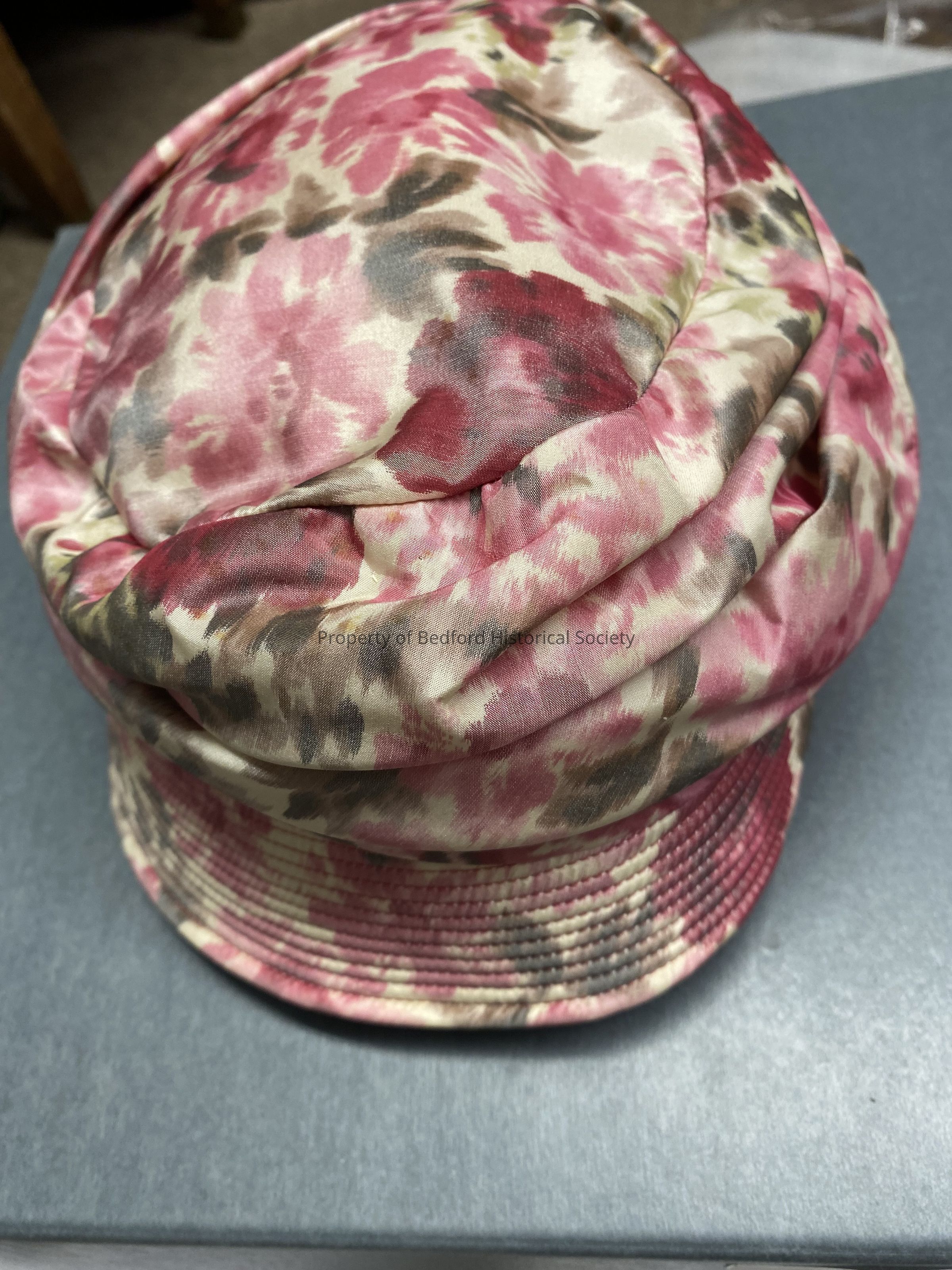 pink floral hat with tag: "jacque-lynn; Washington, D.C." possibly hat referenced in note found in 2022: flowered taffeta cloche hat from a sale at Penwood, Mt. Kisco (the Carll Tucker estate) 1976-7