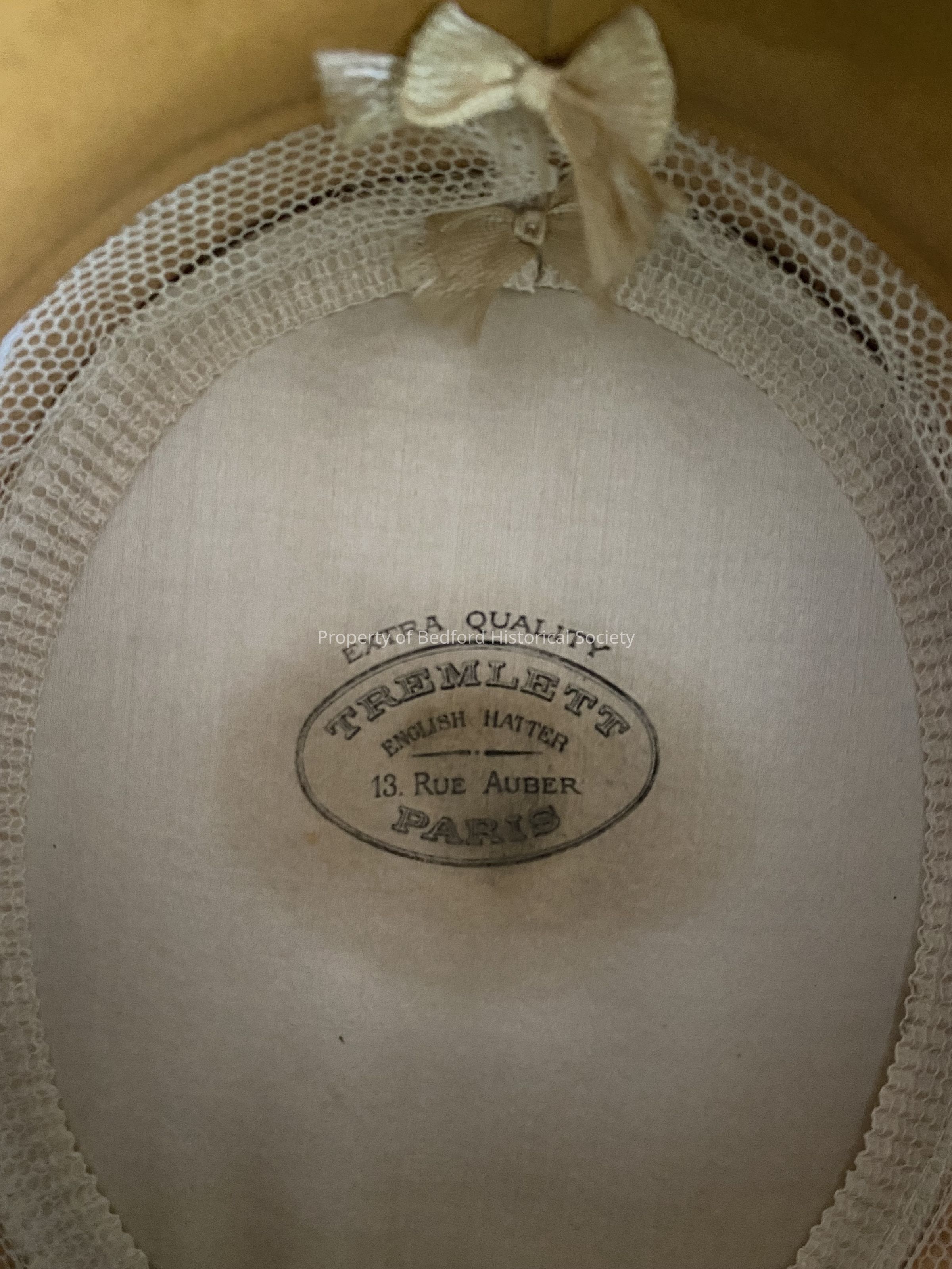 staw hat with interior silk lining with loga "Tremlett English Hatter/ 13. Rue Auber Paris"