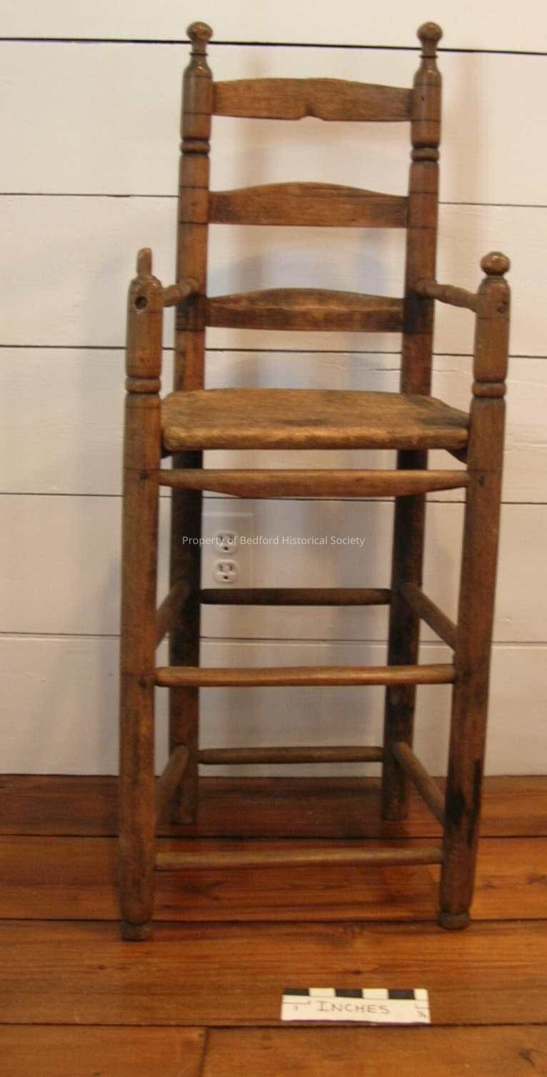 Child's highchair catalogue: 12" x 14" x 38". American hardwood, turned arms and back, three curved back spindles. Note: VERIFY DIMENSIONS! this had no number on it. (EZ 2008)