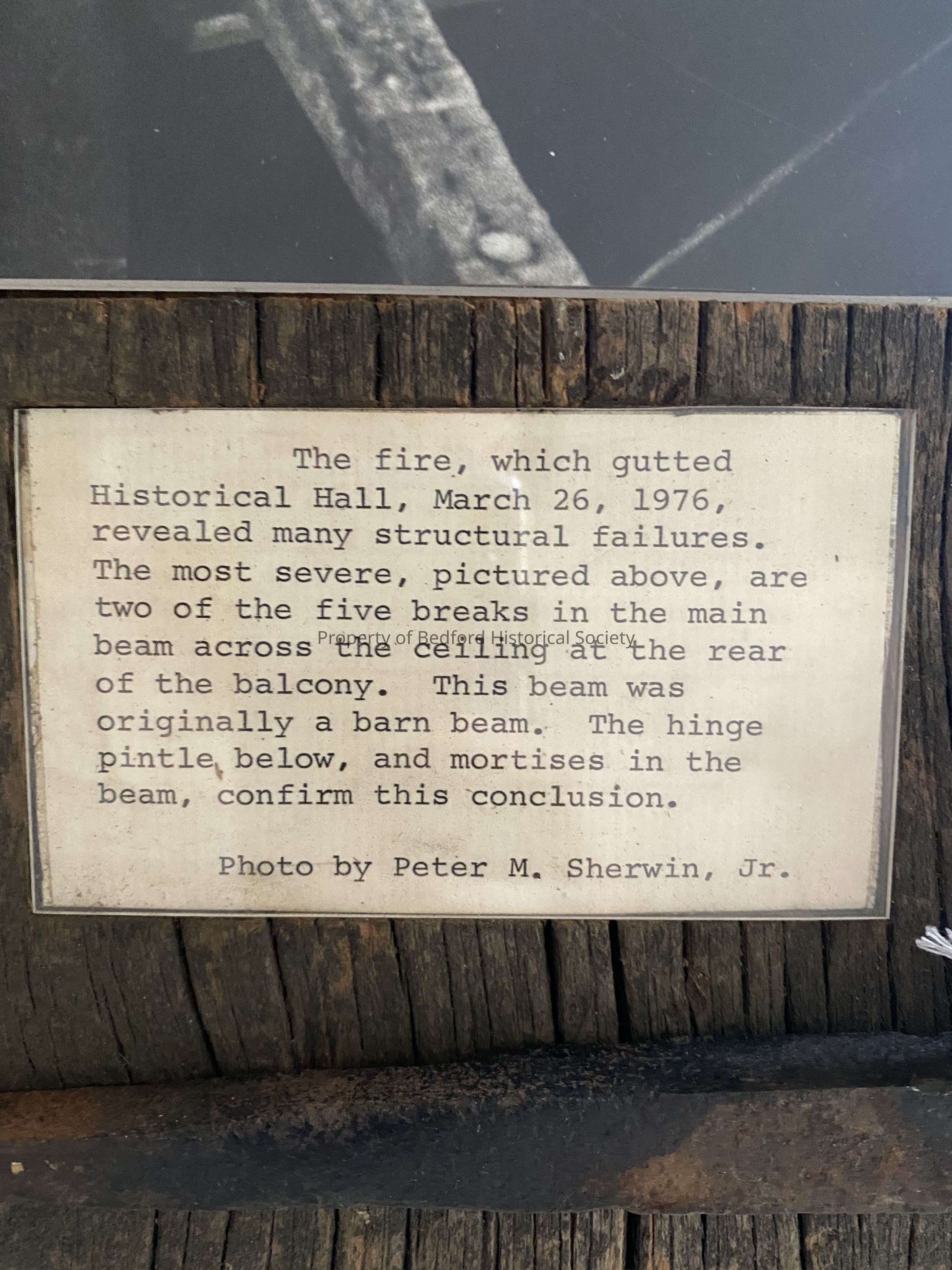 Wooden plaque (probably home-made) with photo of scroched barn beam by Peter M. Sherwin Jr. with typed description commemorating fire at Historical Hall on March 26, 1976