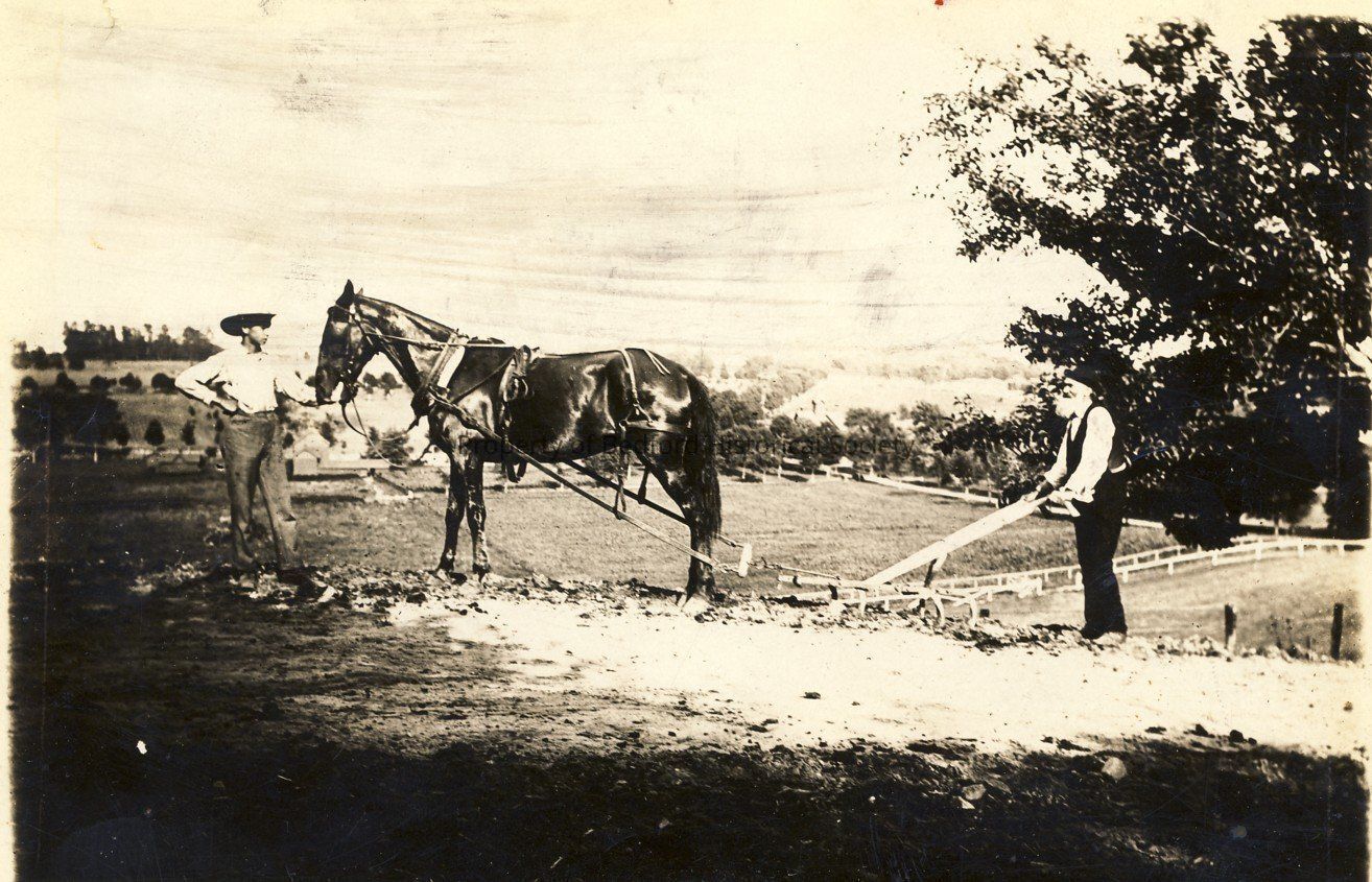 Horse and Plow with two workers. Plowing before the turn of the century.