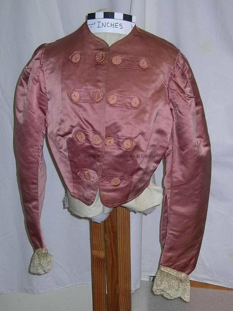 Orchid silk satin jacket, circa 1905, embroidered label: "Martin & Co. 7 West 38th Street," military inspired tabs with self covered buttons, the buttons embroidered in matching thread with faux three-dimensional shading, good condition, one button missing top.