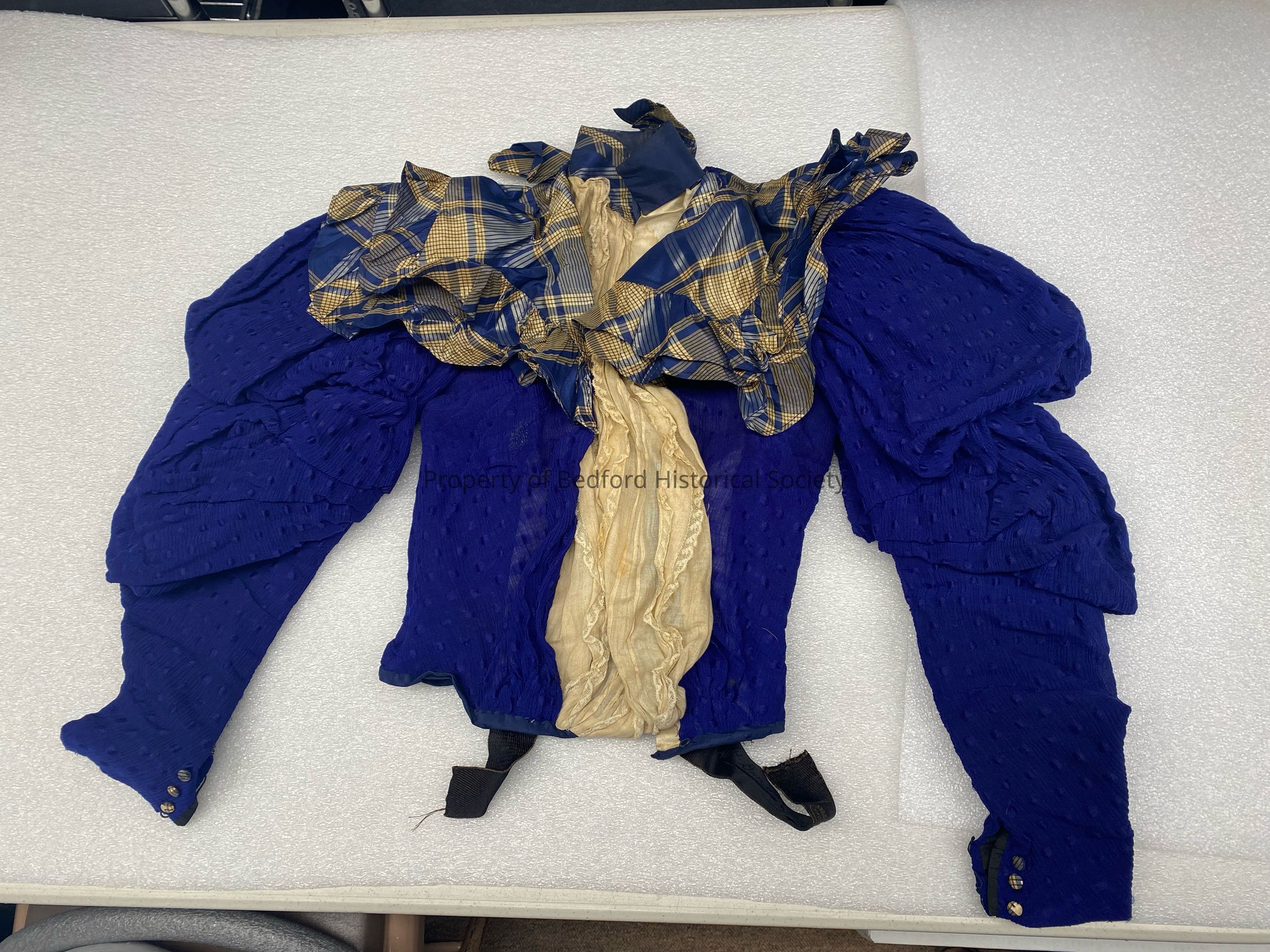 Royal blue Leg O' Mutton sleeve jacket with plaid blue and beige collar.