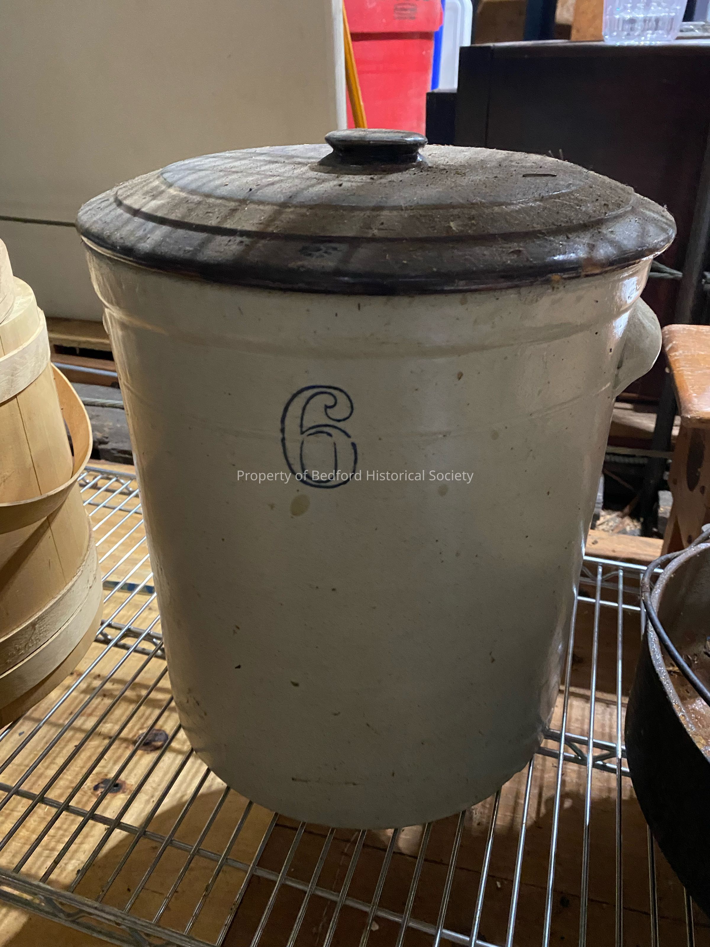 Large stoneware jar with lid and number 6 stenciled in blue