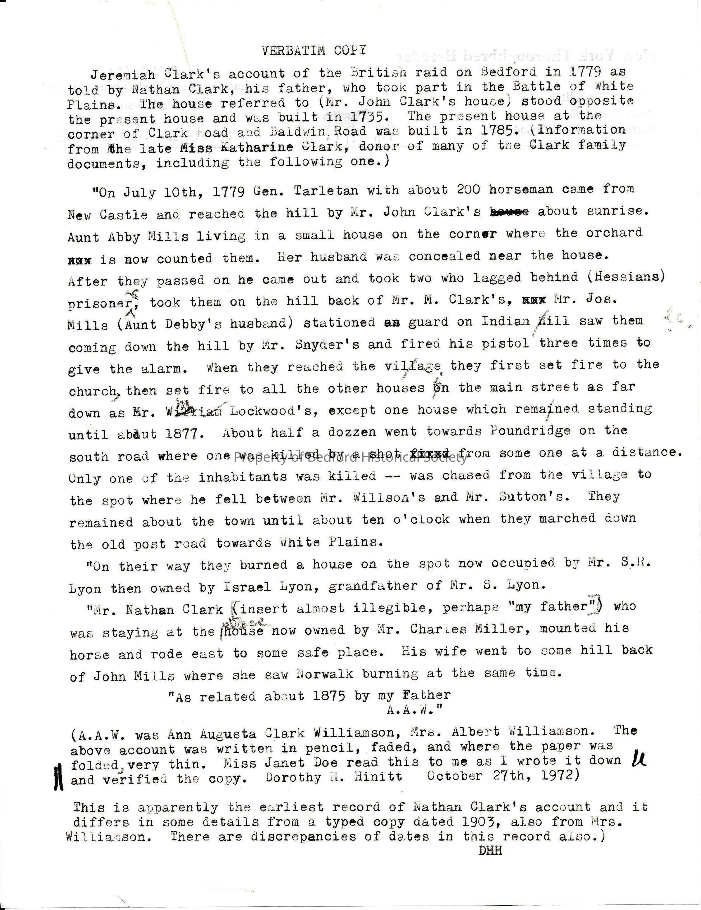 Jeremiah Clark's Account of the British Raid on Bedford in 1779 (V.07.56a located in DAB #3) as related to Ann Augusta Clark Williamson (Mrs. Albert Williamson, the daughter of Jeremiah Clark)