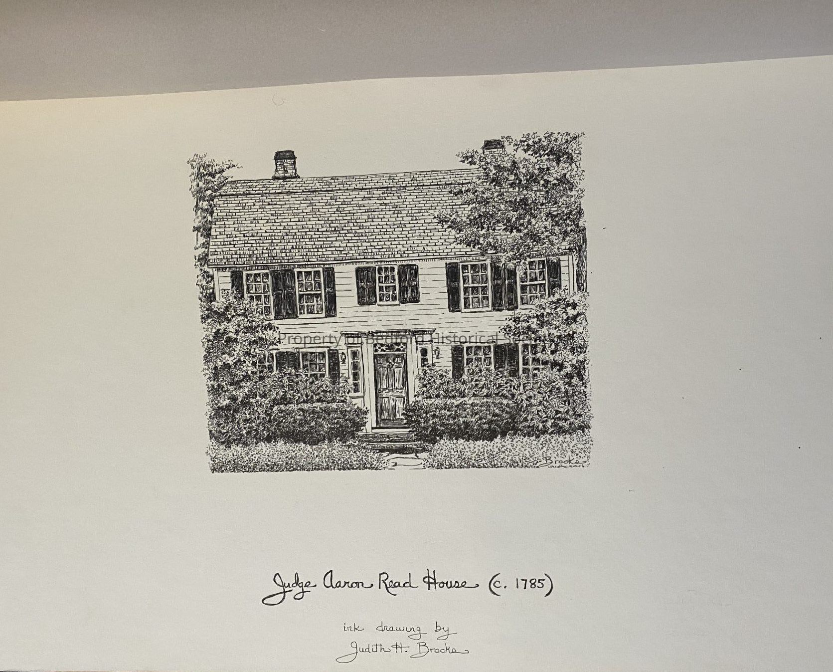 Ink drawing of Judge Aaron Reed House (c.1785) by Judith H. Brooks, 1980 (in original cardboard support)