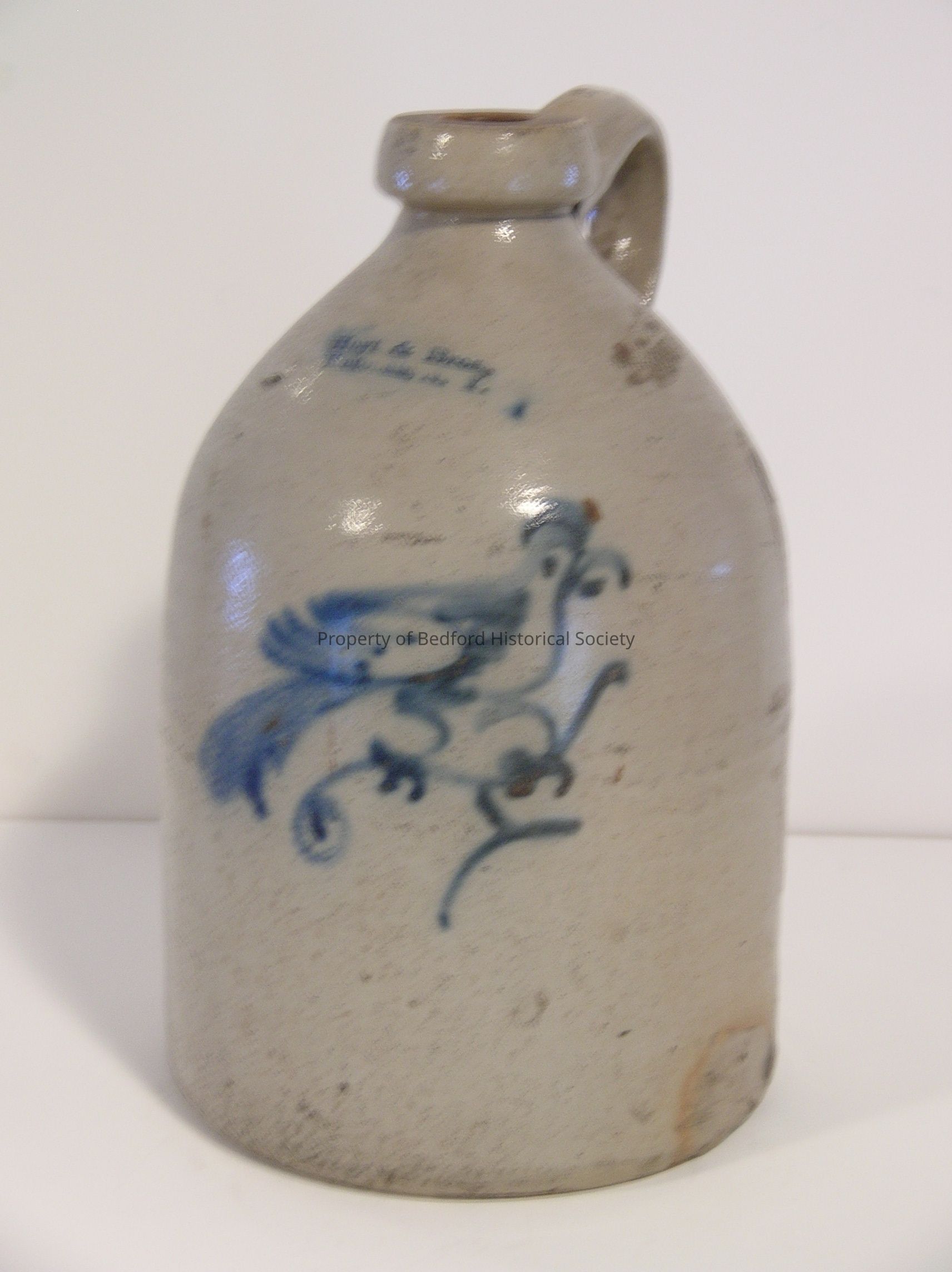 Stoneware jug with handle by "Hoyt & Bros., Katonah, New York" Circa 1870-1880, 11" tall. Grey with blue design of bird.
