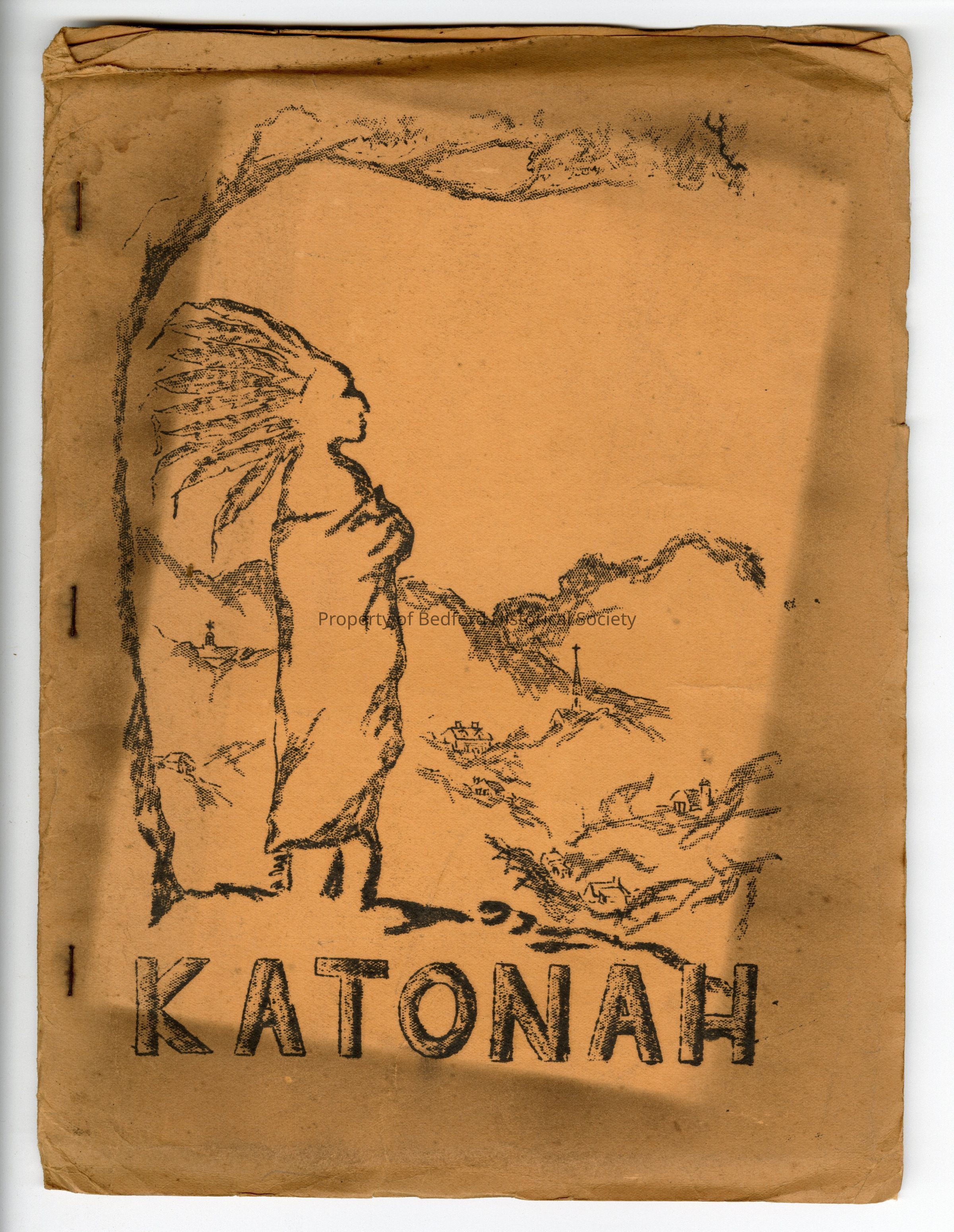 home-made class project booklet on the history of Katonah with drawing of Native American on cover made with orange paper, inside type written pages and drawings