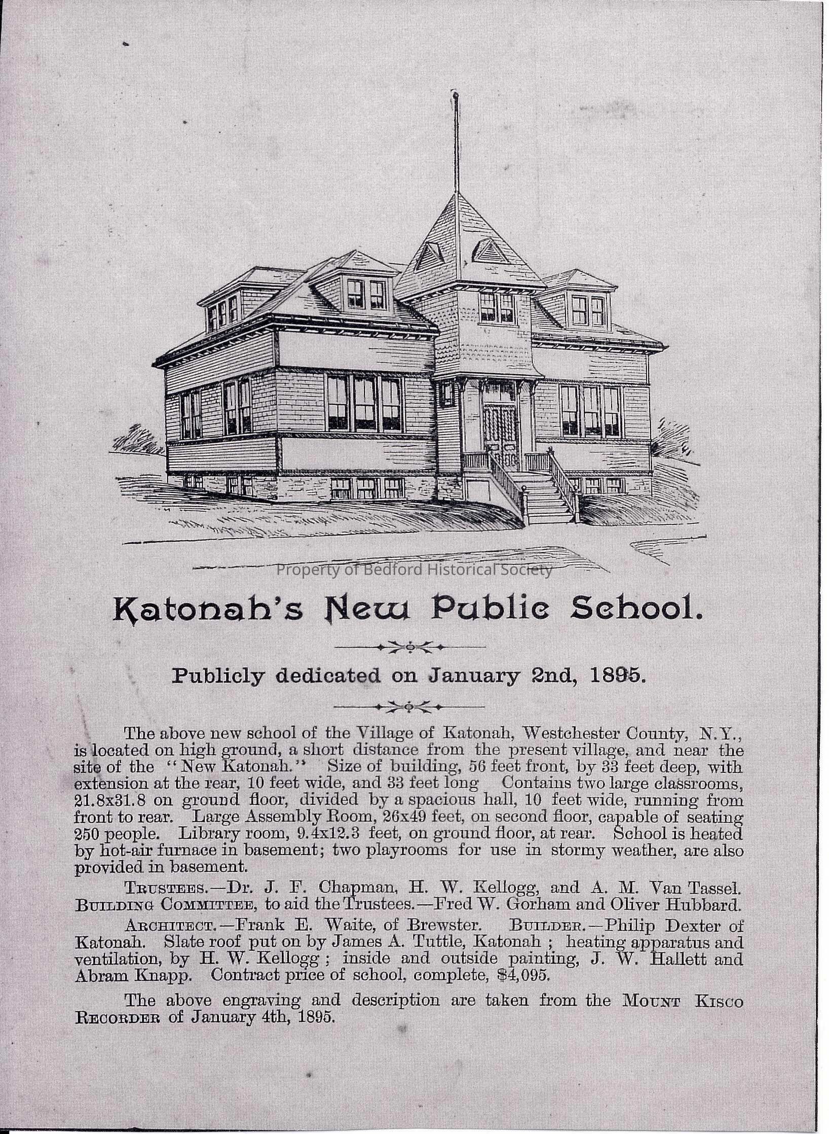 Two photocopies of an advertisement for Katonah's New Public School, dedicated on January 2, 1895, taken from the Mount Kisco Recorder of Jan. 4, 1895
