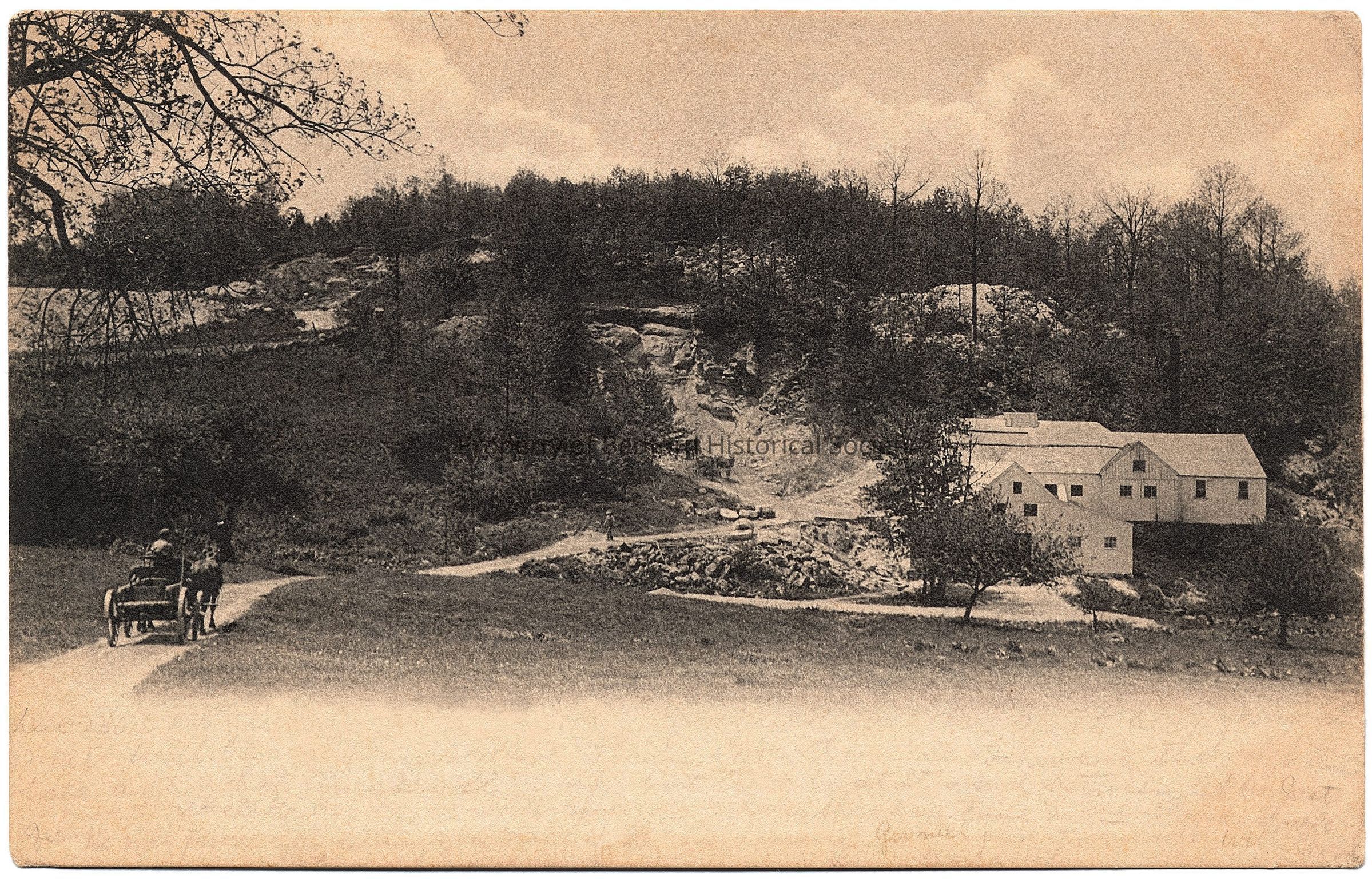 B & W photo, view of Kinkel Quarry with horse and buggy carriage in left side of frame