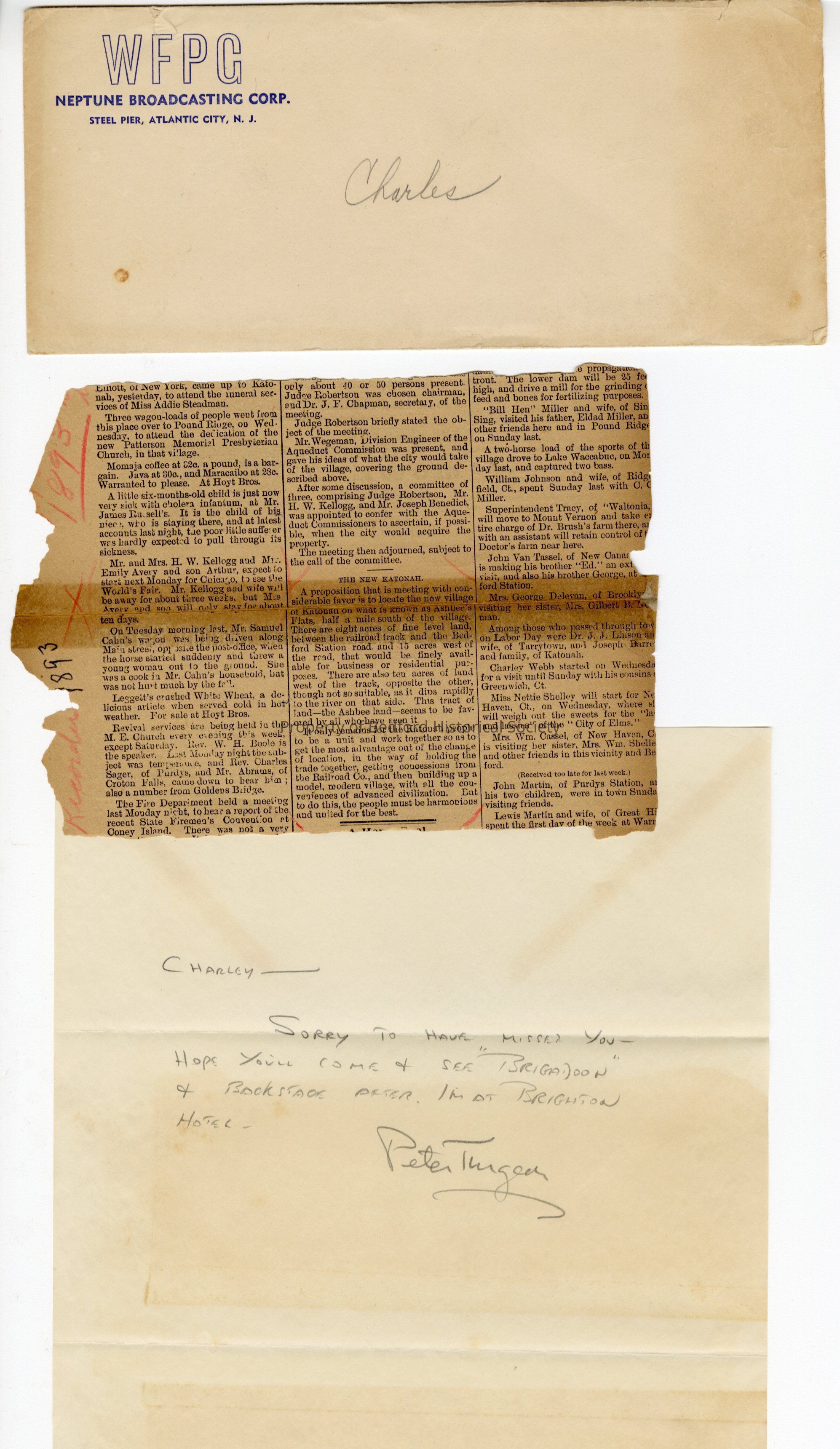 Letter and envelope from Peter Trueger? to Charles W. Avery with enclosed newspaper article from 1893 where is grandmother Emily and father Arthur are mentioned.
