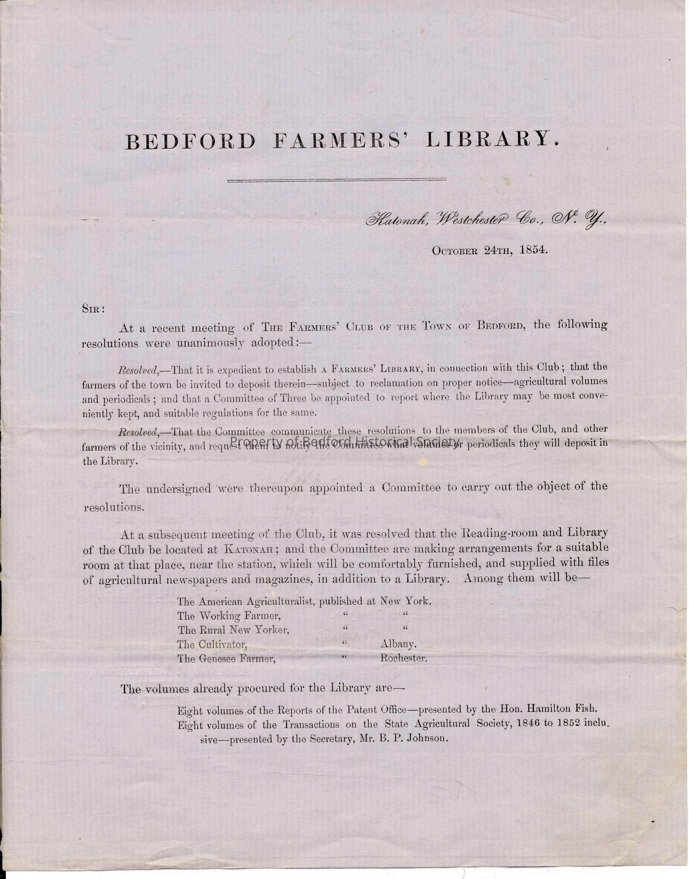 Letter announcing establishment of Farmers Library and appeal for agricultural works or newspapers, 1854 *includes transcription