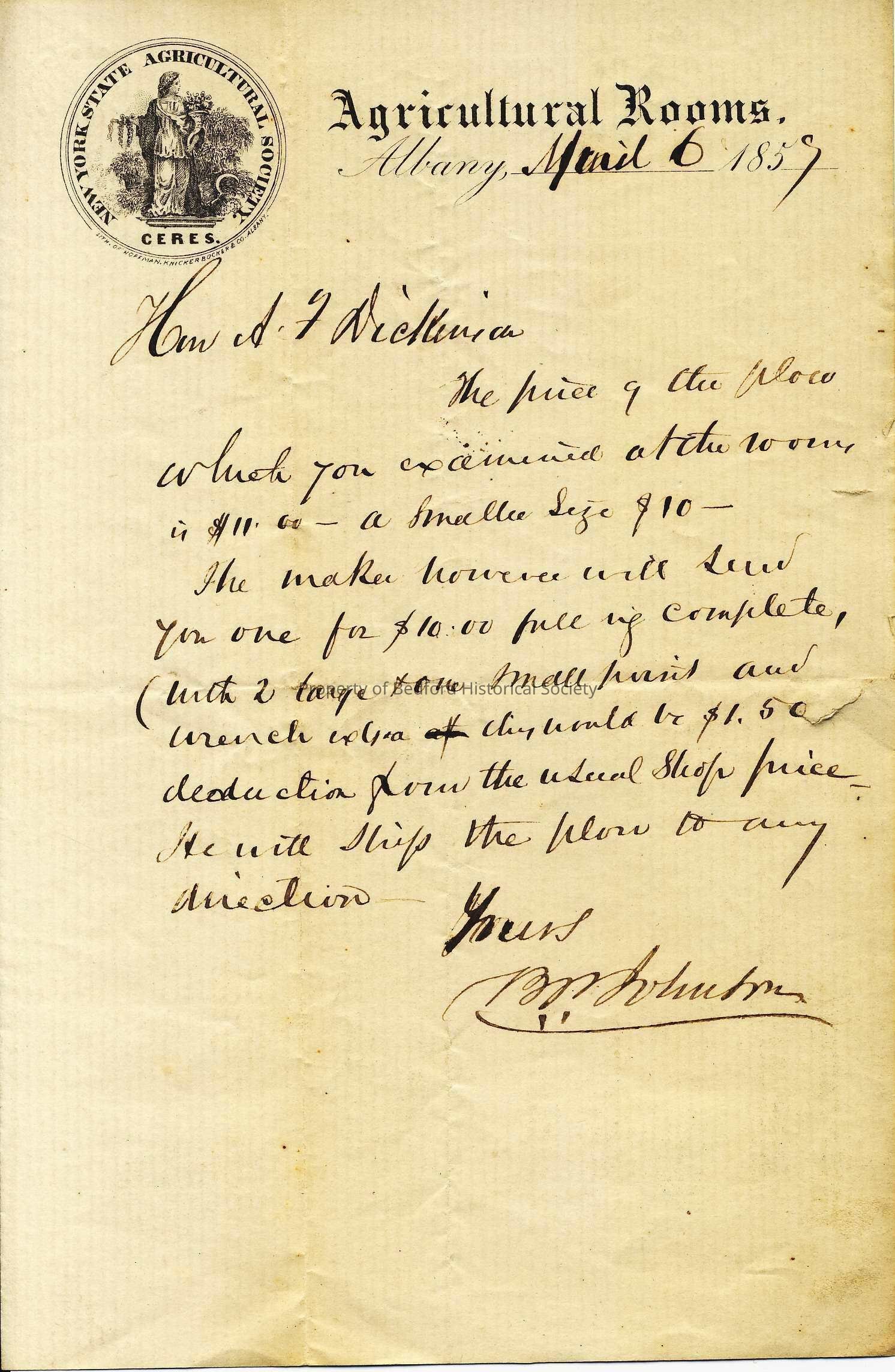 Letter from B.P. Johnson to A.F.Dickinson, 1857
