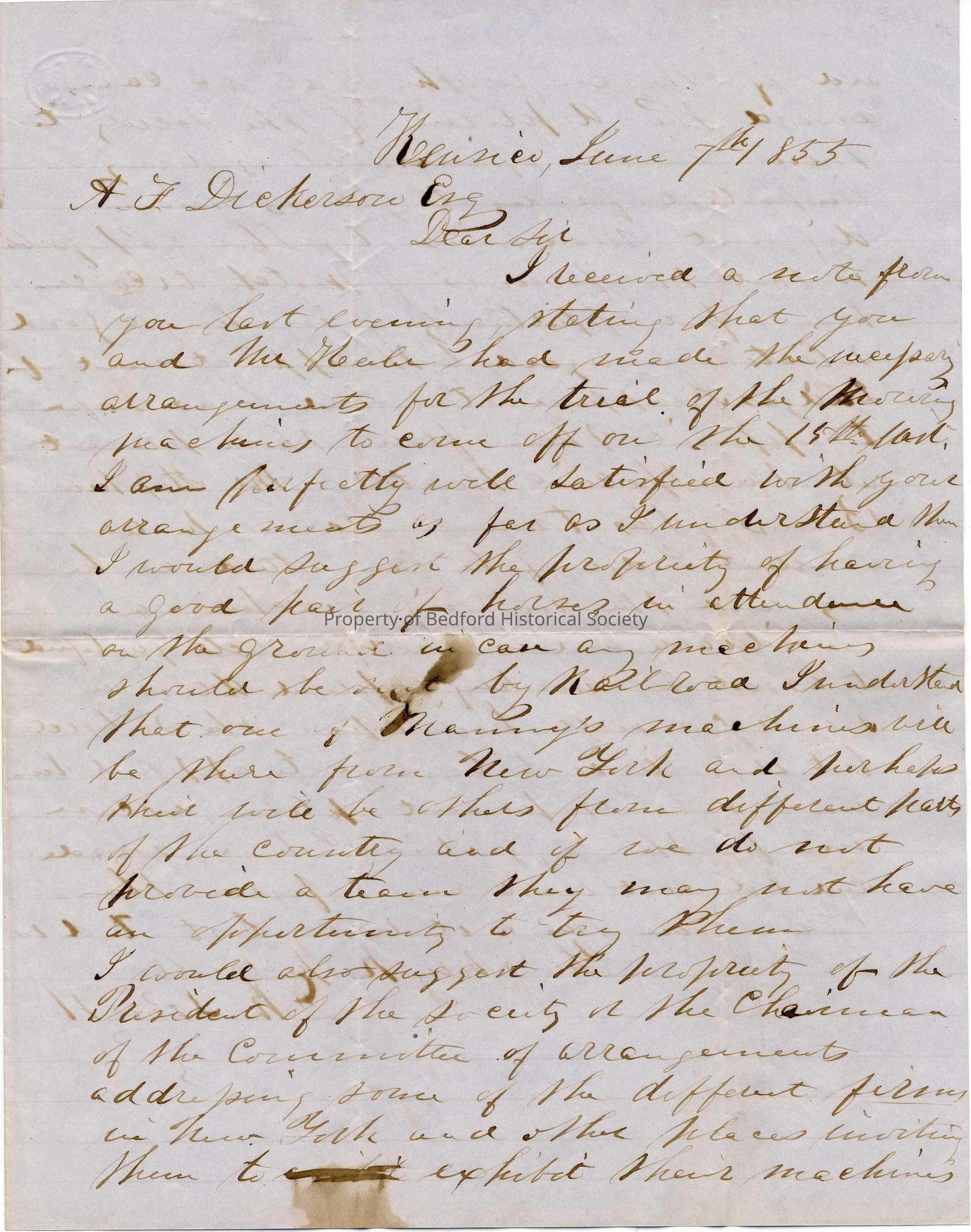 Letter from D.W. Smith to A.F. Dickinson about trial of mowing machines to take place on the 15th, June 7, 1855