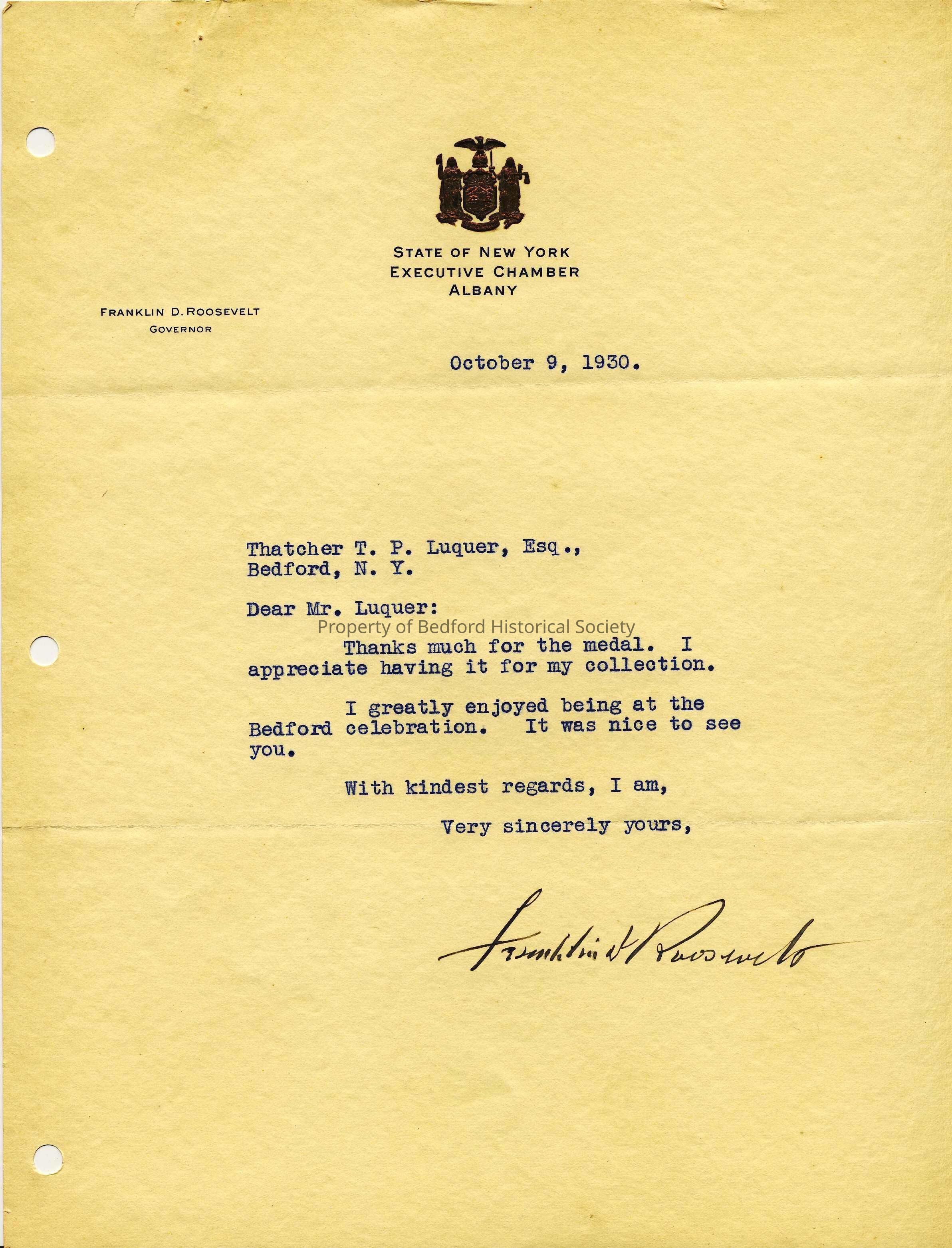 Letter from Franklin D. Roosevelt to Colonel Thatcher T.P. Luquer regarding the town's 250th Anniversary, 1930