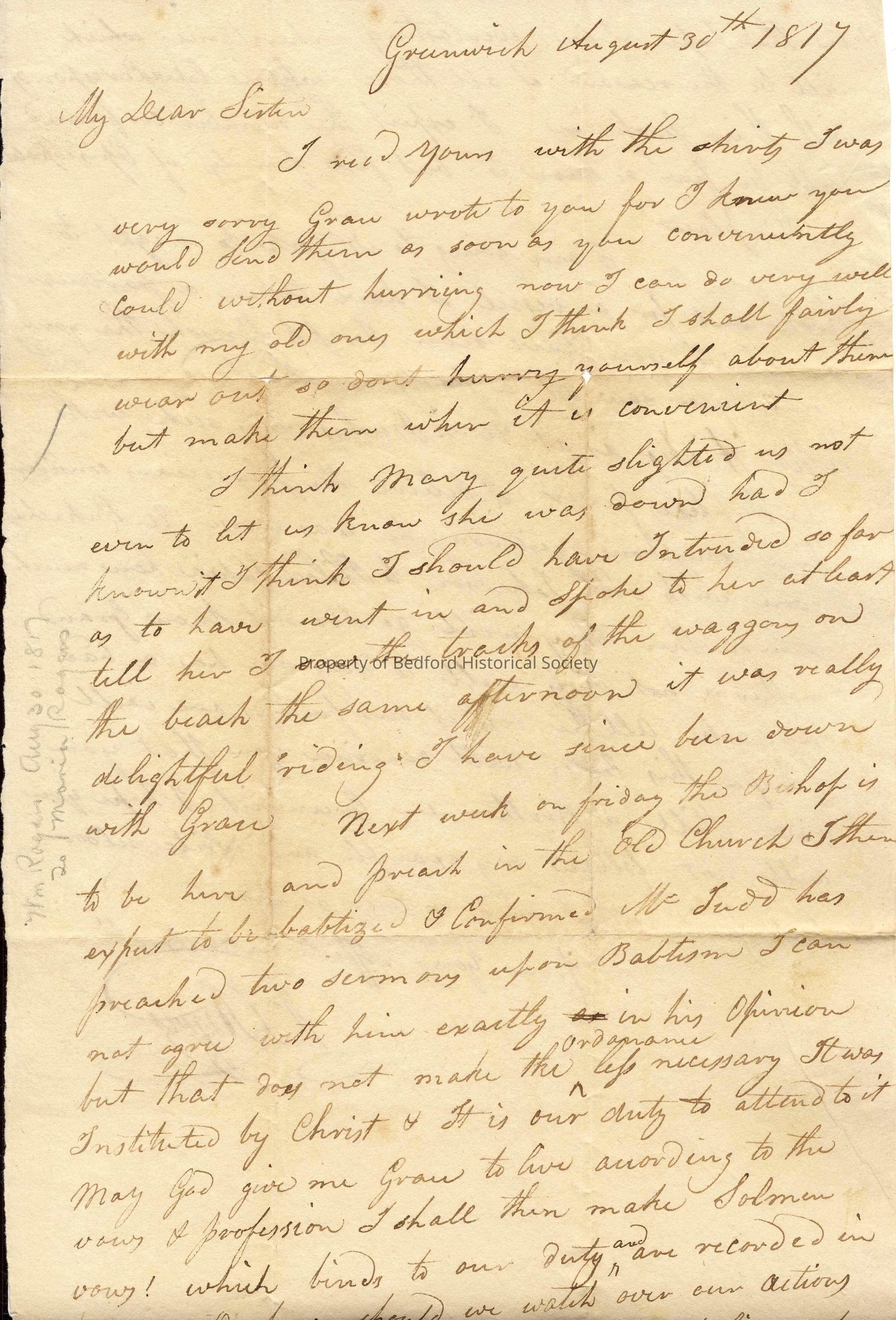 Letter from William Rogers to his sister, Maria Rogers, dated Aug. 30, 1817 *transcription in transcriptions binder