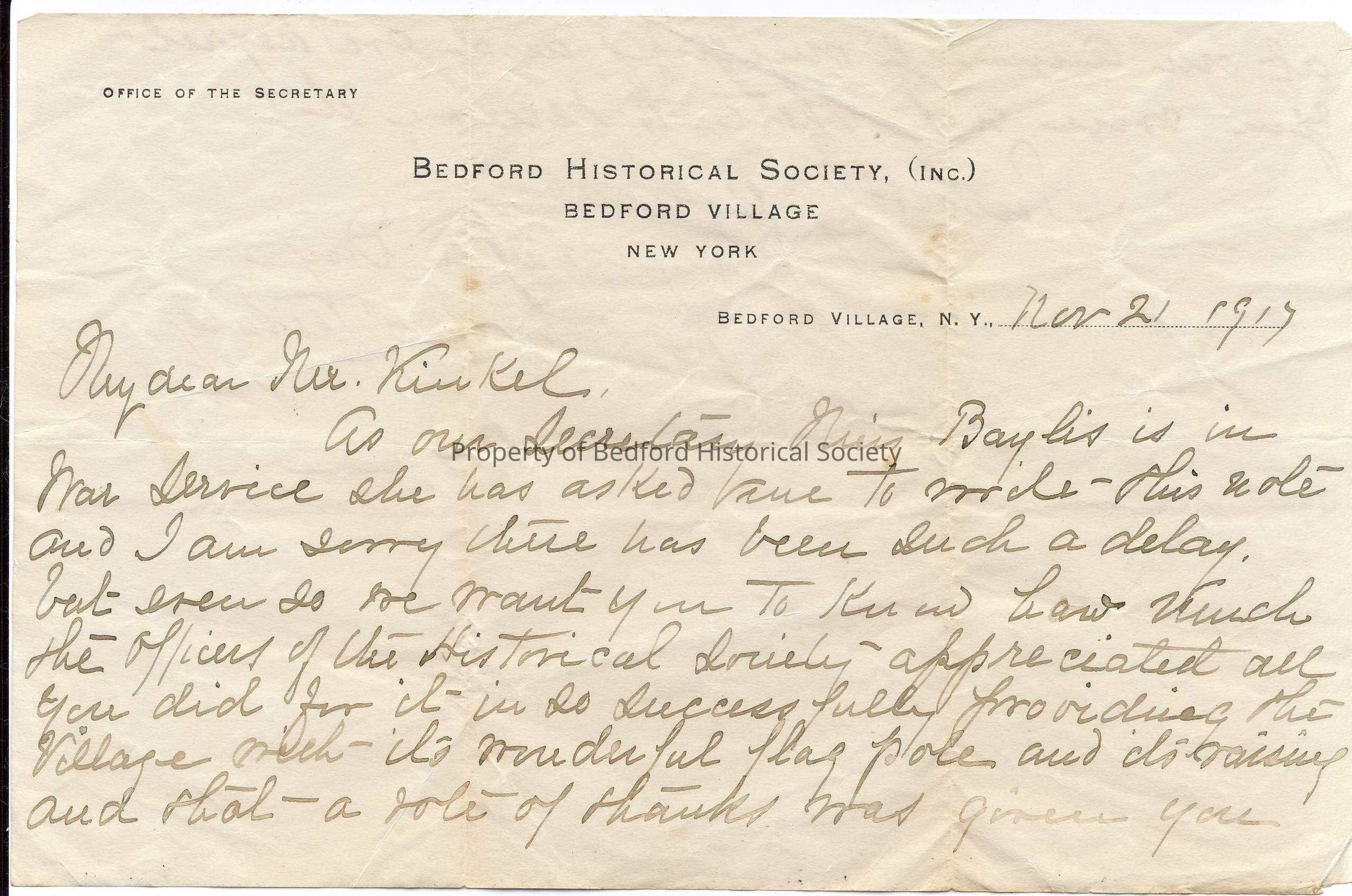Letter to Mr. Kinkel from Bedford Historical Society relating to gift of flag for the Green, 1917