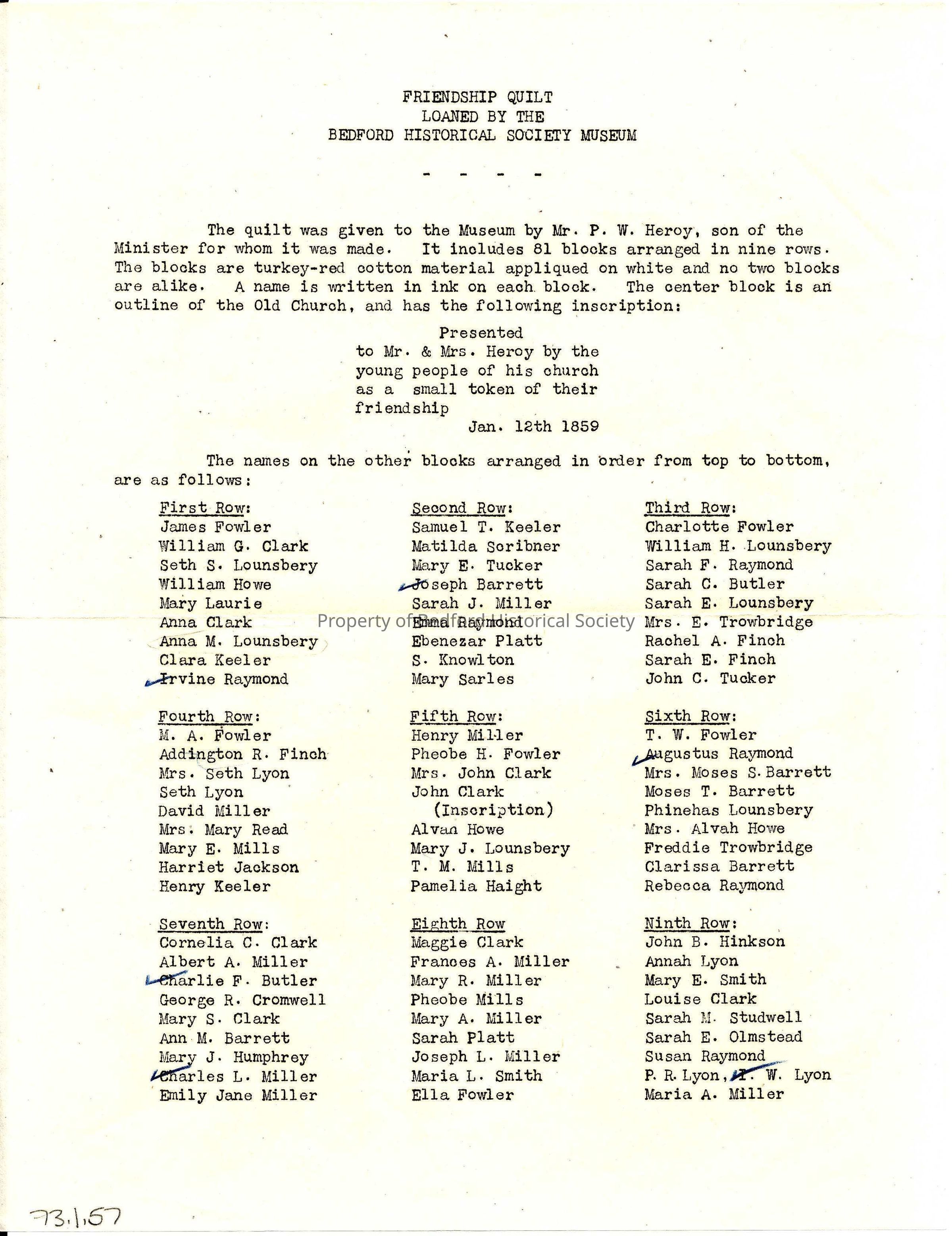 List of names of the creators of the red and white friendship quilt presented to Mr. and Mrs. Heroy in 1859 and in the collection of the Bedford Historical Society.