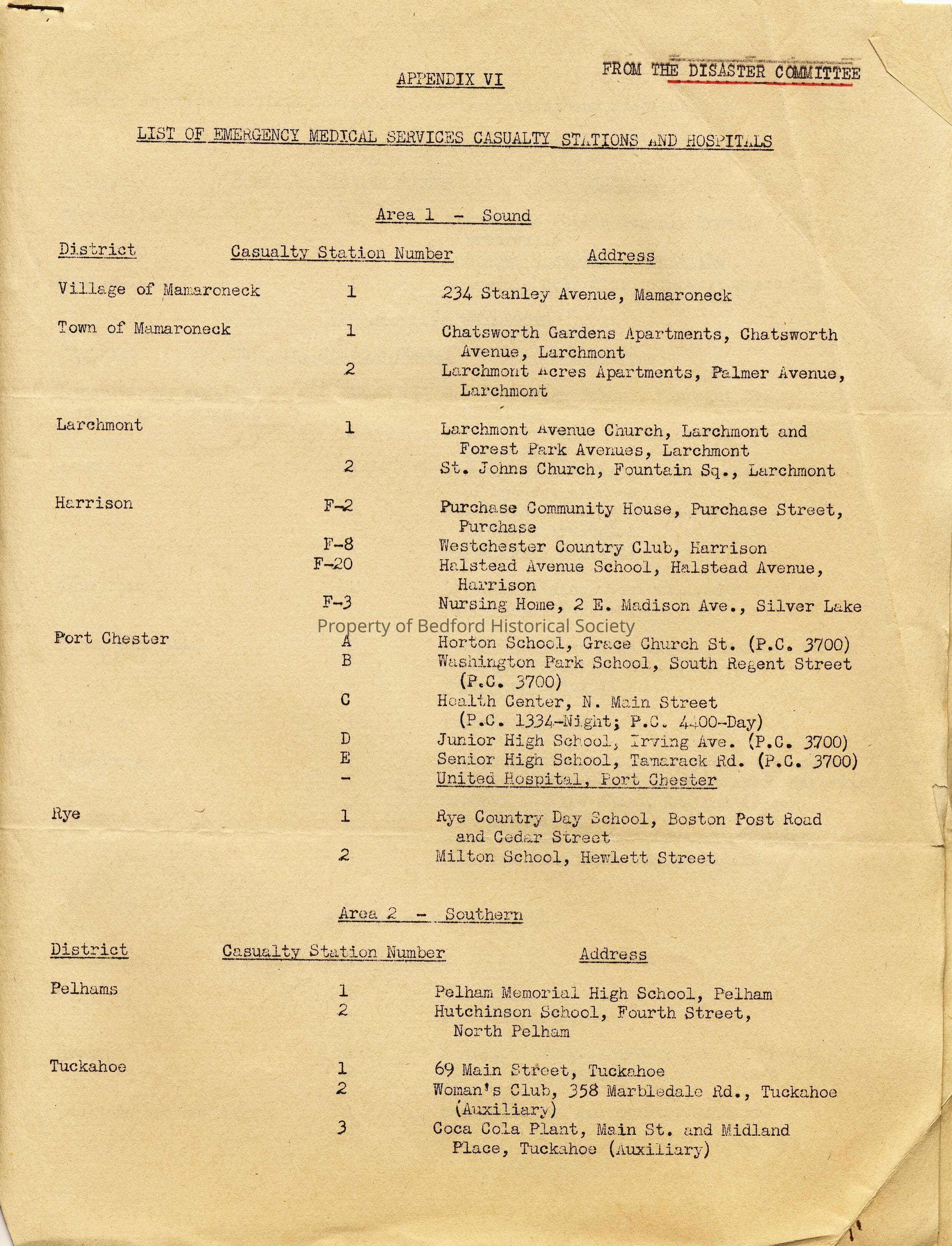 Bedford Disaster Committee: List of Emergecy Medical Services Casualty Stations and Hospitals, 1943