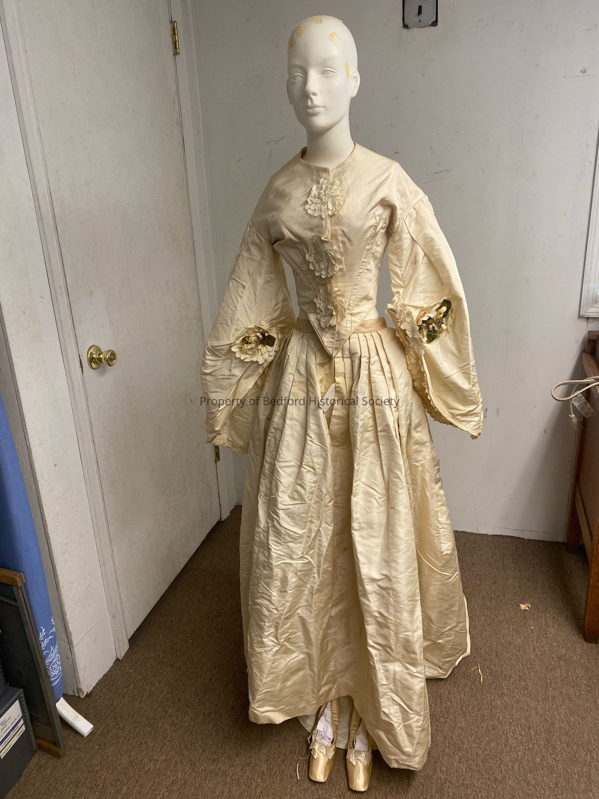 1834-1894) on May 3, 1860. Note inside said "Mother's wedding dress" from Mrs. Thomas L. Purdy, Jr. Purdys, NY and Heritage, NY. Ensemble comes with two pairs of shoes.
