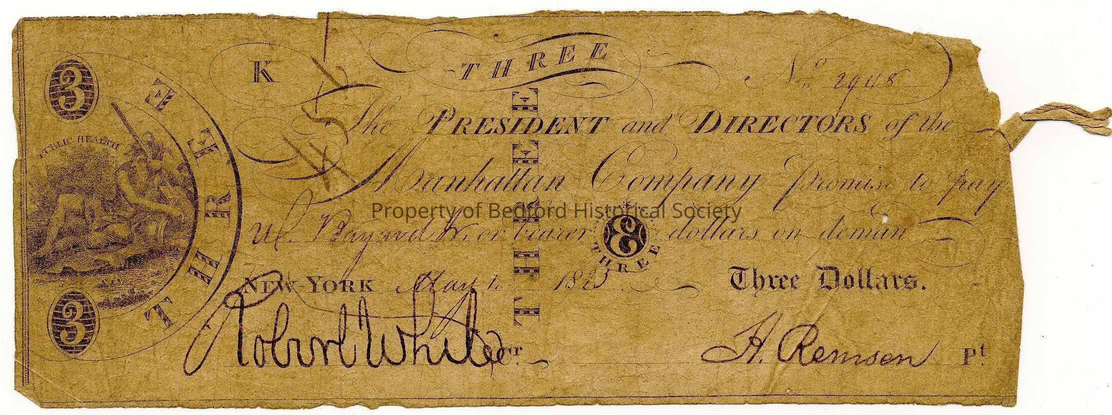 Manhattan Company $3 Bank Note, 1825