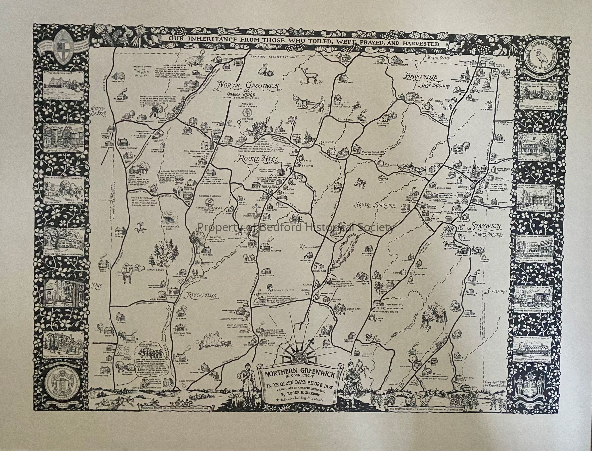 Map of Northern Greenwich, CT before 1875 with illustrations of buildings