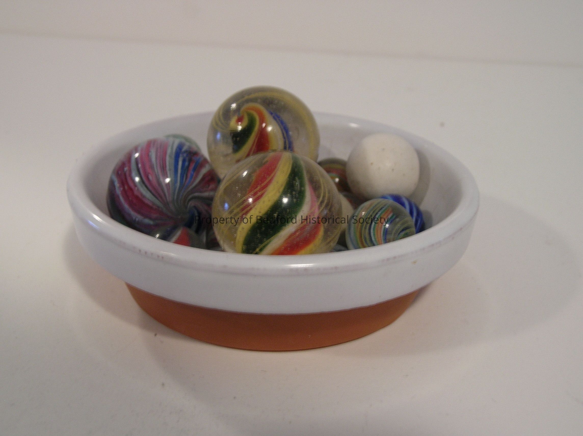 A collection of late 19th century, early 20th century glass and clay "playing" marbles. 18 small and 3 large marbles, colored swirl interiors, executed like old paperweights. Marbles belonging to Albert Clark who took them with him to play at Bedford Academy. Were used by boys at Bedford Academy.