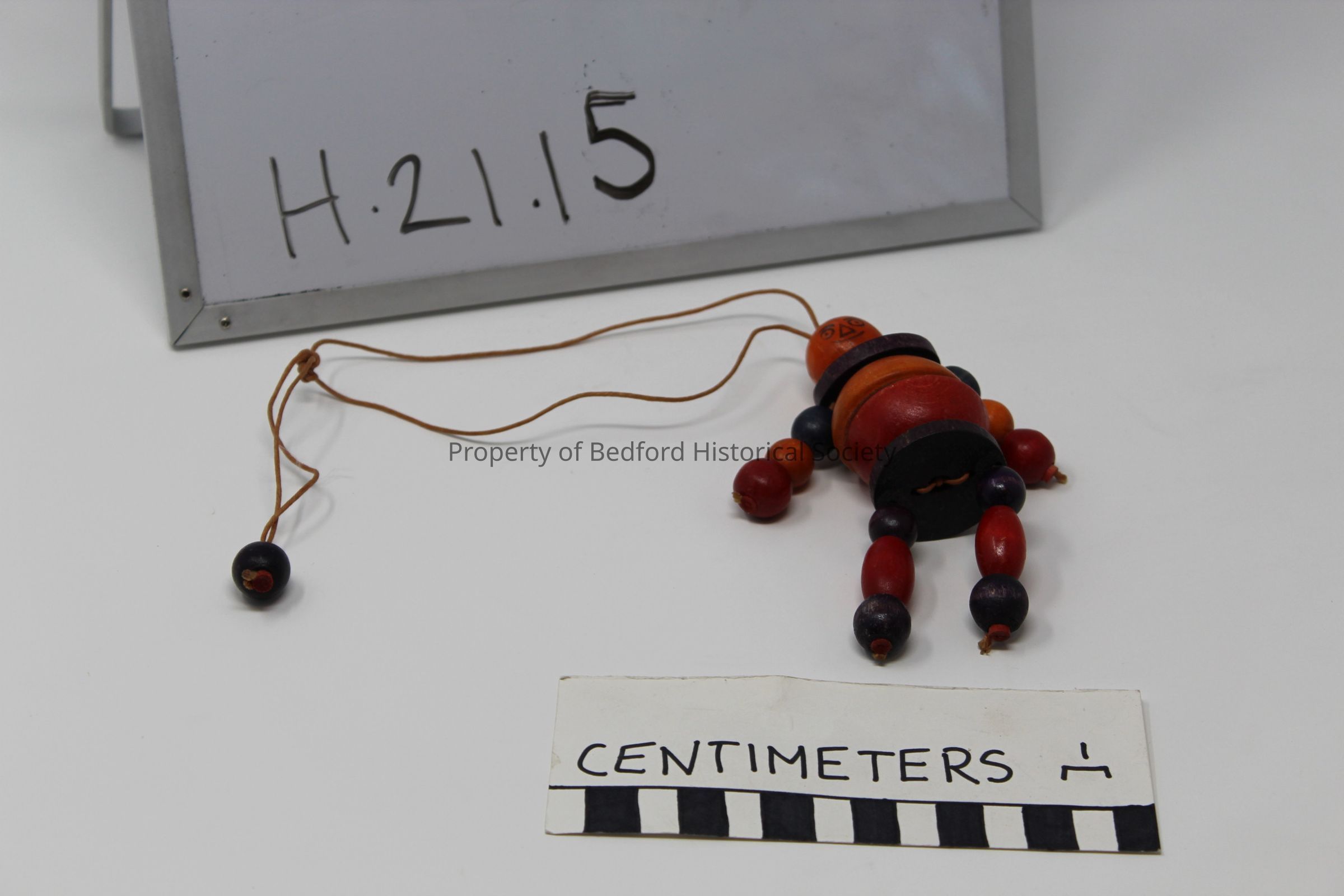 wooden pumpkin figure marionette, attached circular wood pieces painted red, orange, dark blue and purple 5" Long
