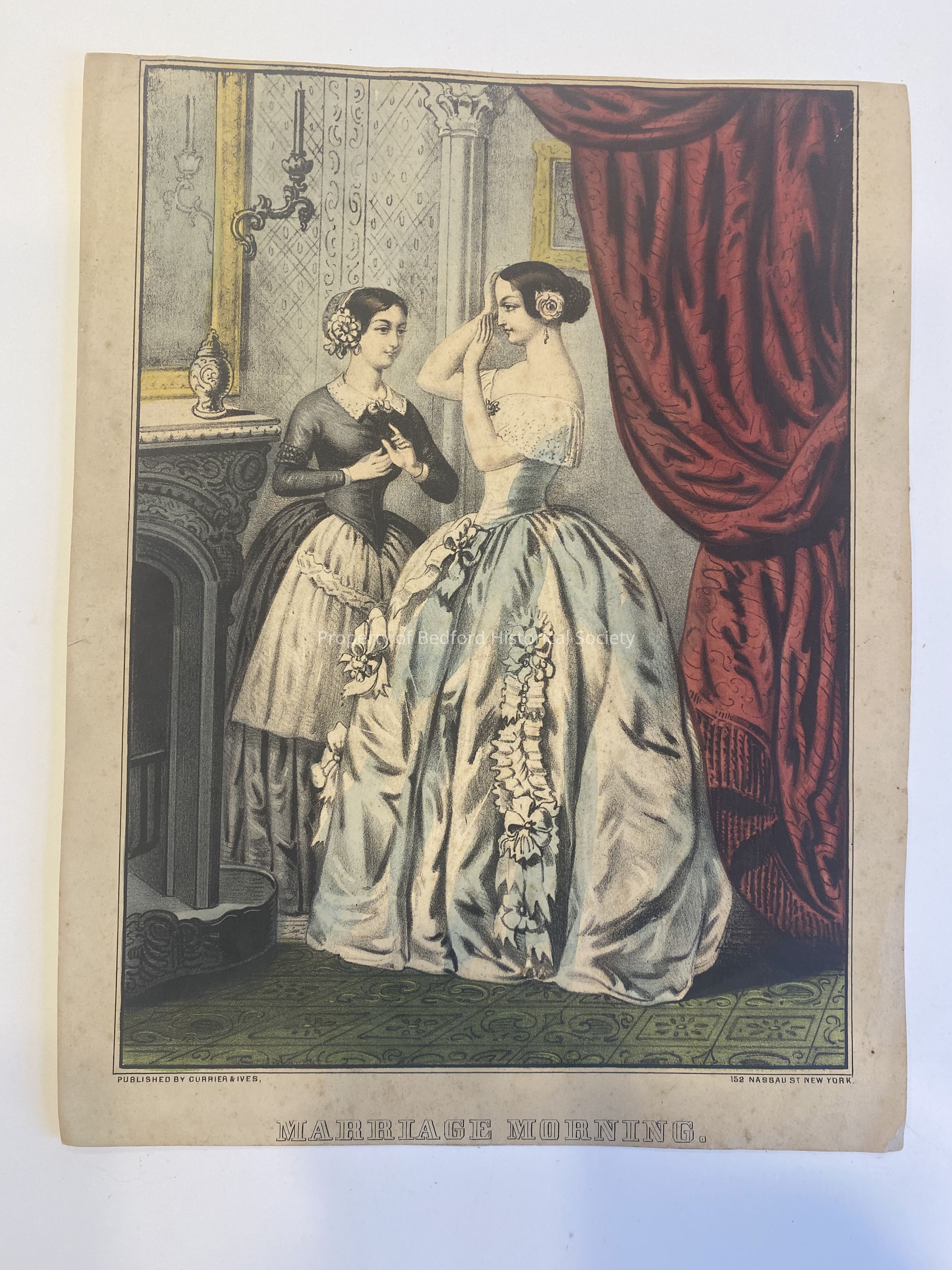 Currier and Ives print of a woman dressed in a white gown with blue shadows being prepared by her maid for her wedding