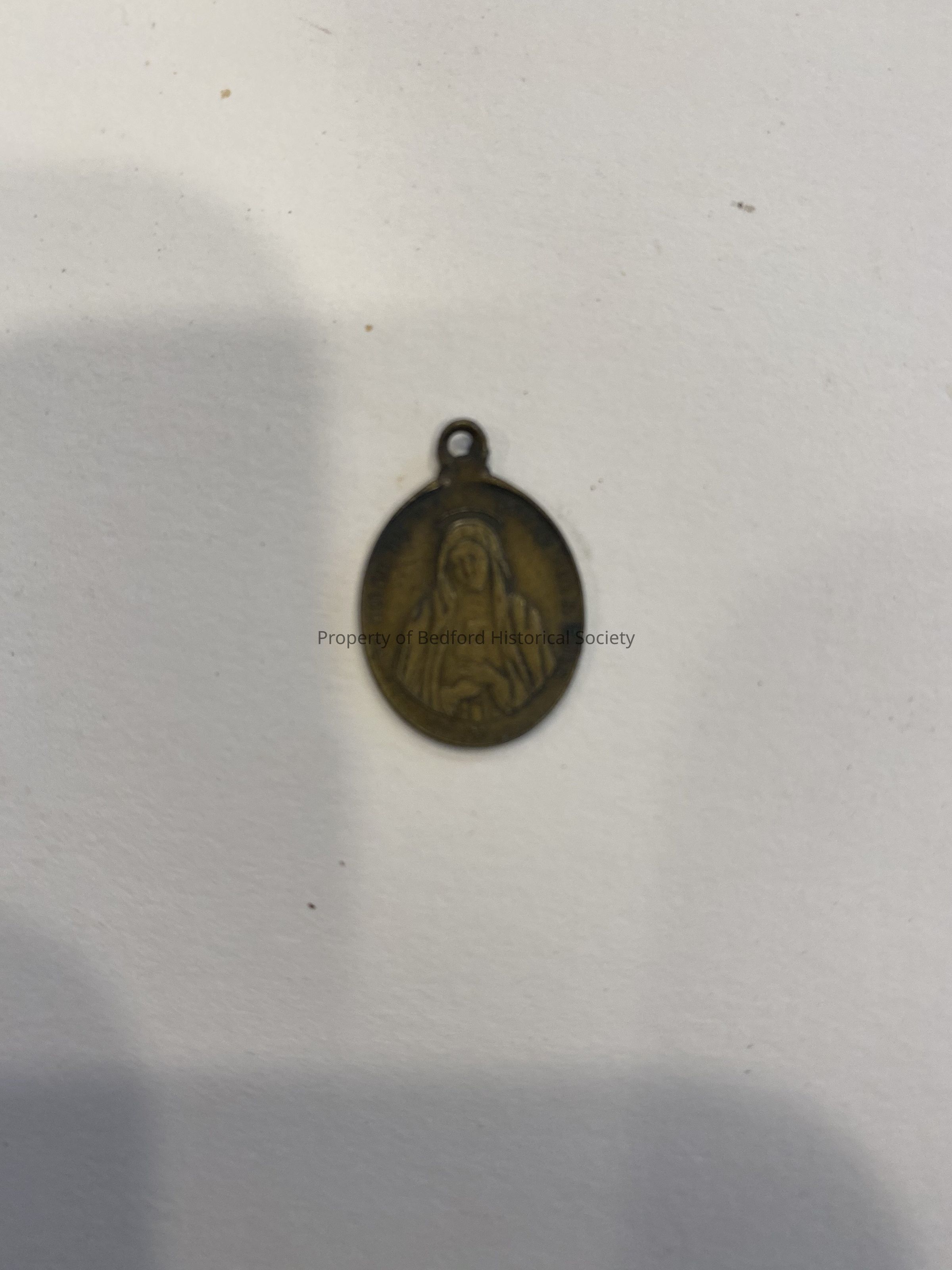 religious medal with relief carving of Virgin Mary on one side, saint on the reverse