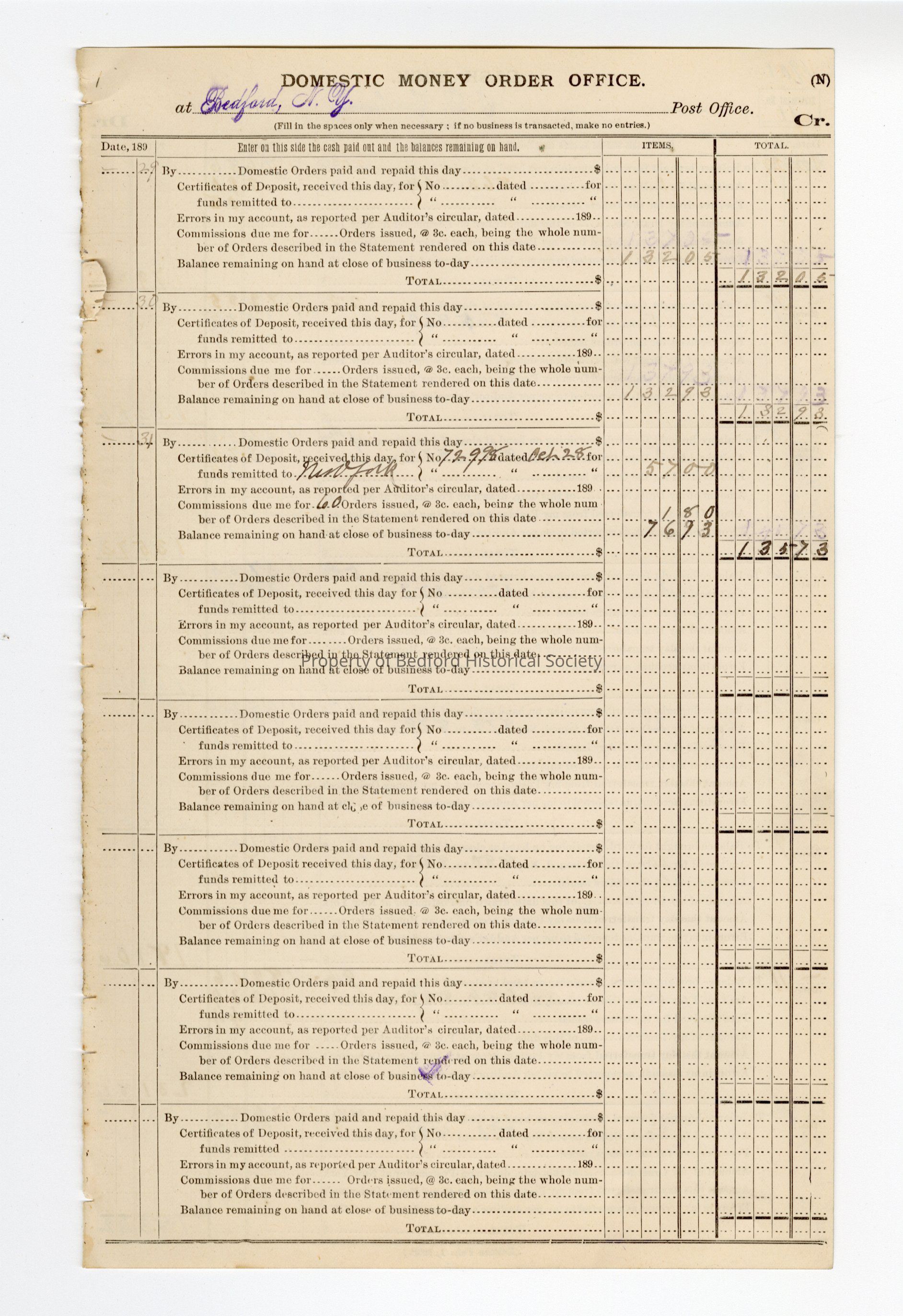 Domestic money order from Bedford Post Office from 1890s