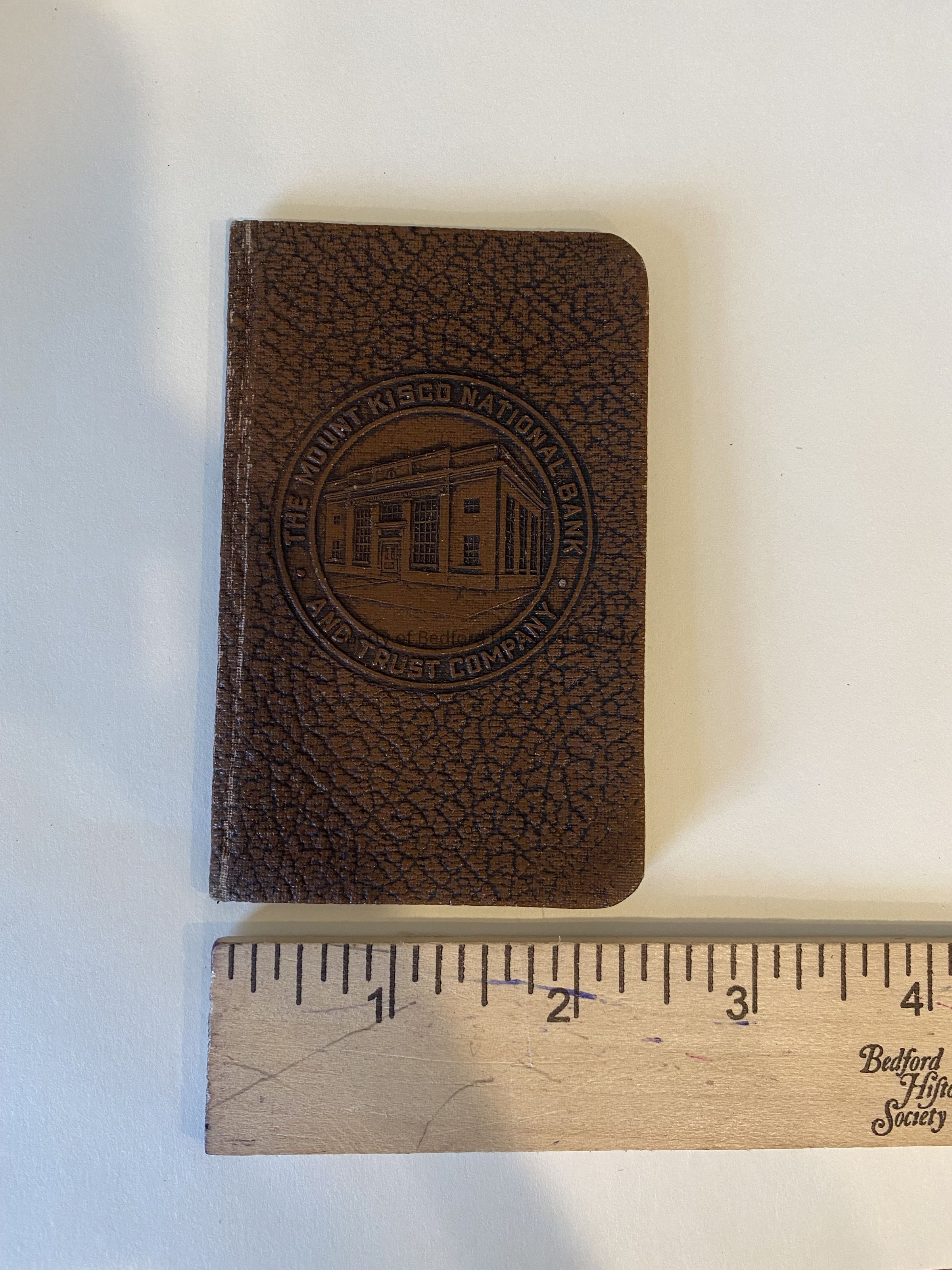 Brown leather bound bank book, Mount Kisco National Bank and Trust Company printed around medallion of engraved bank. Inside "Ruth H. Parkinson; Bedford Hills"
