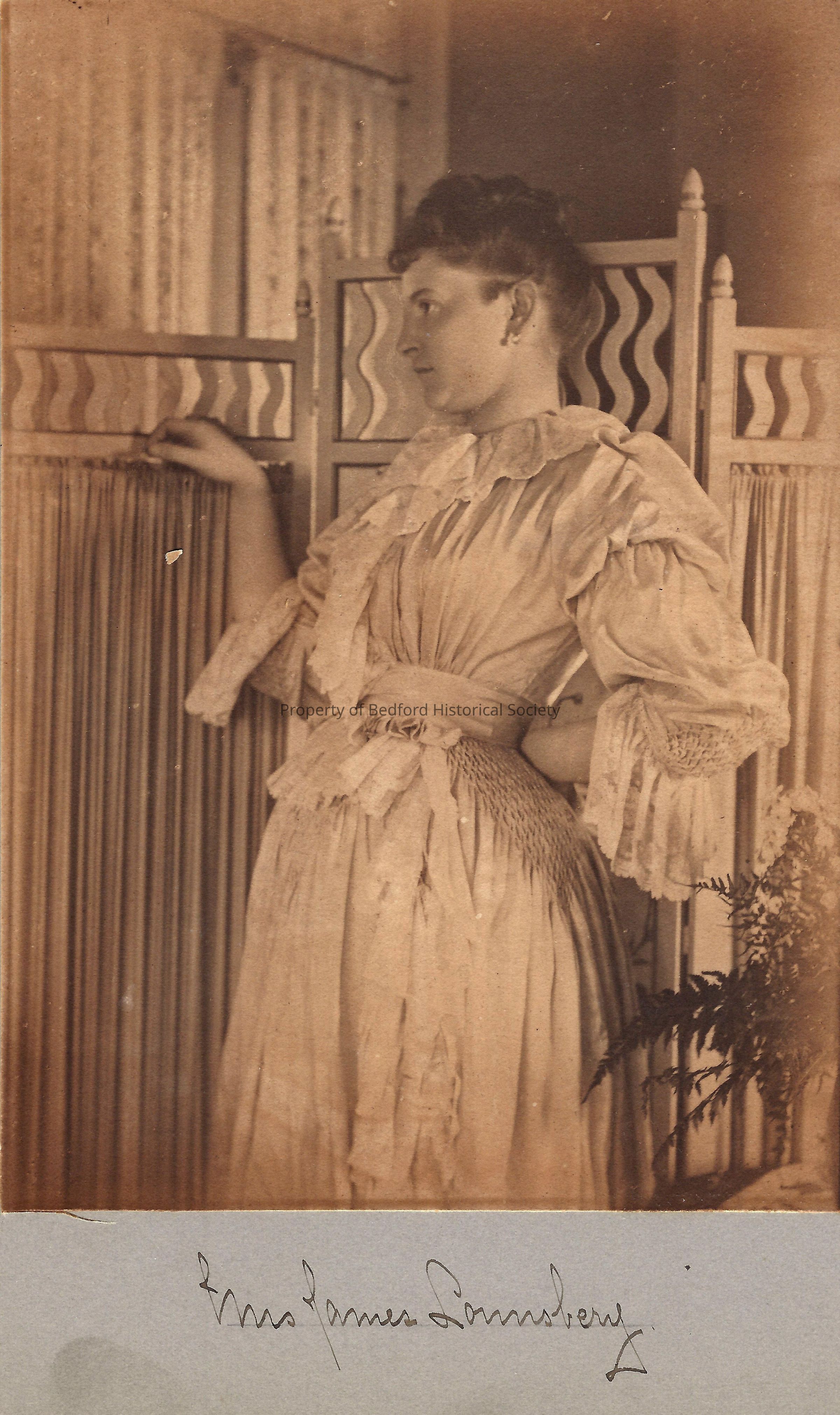 B & W photograph of Mrs. James Lounsbery (Clara) posing in front of a dressing screen, late 19th century. From Renwick scrapbook