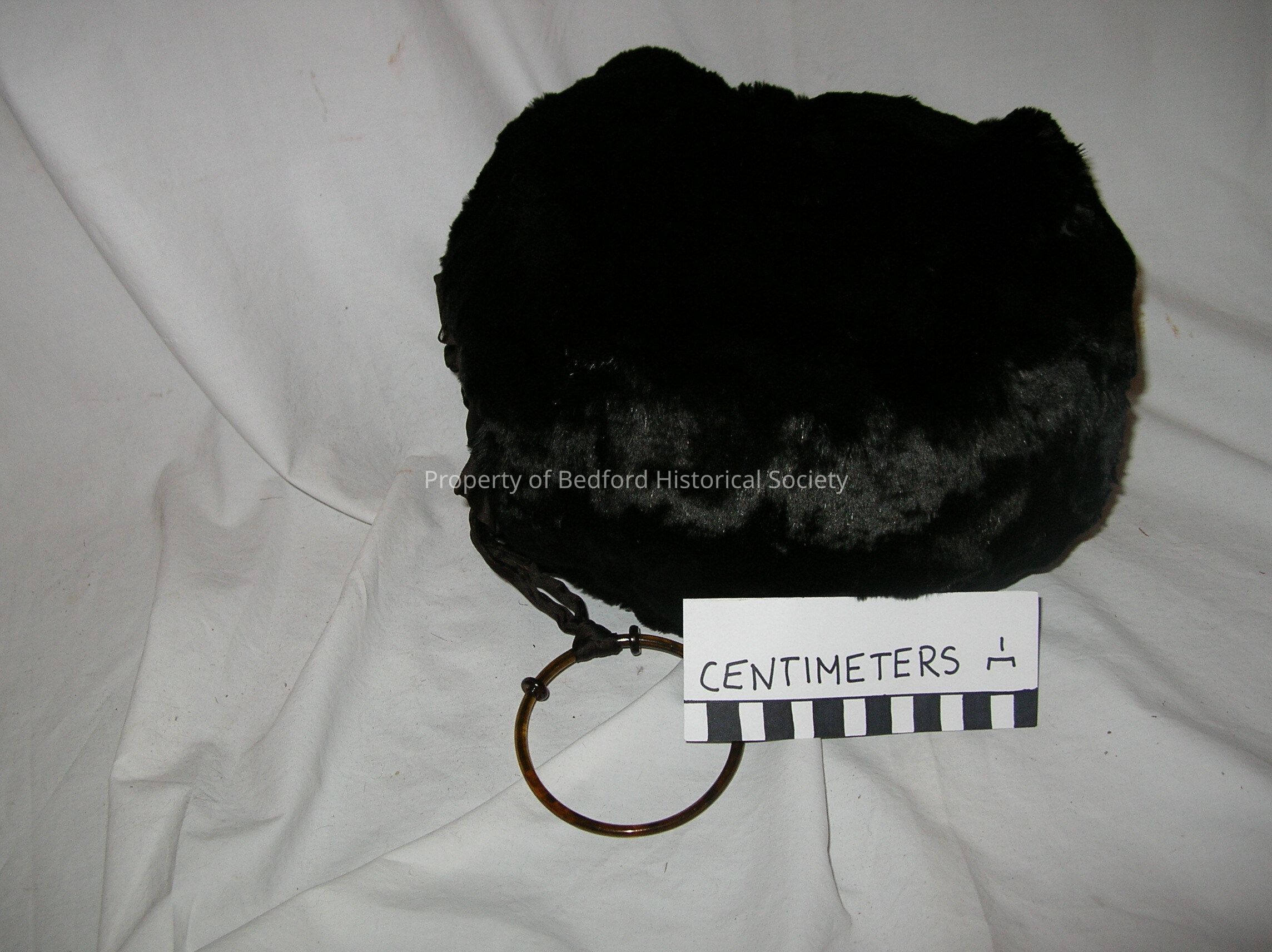 Circular Brown Muff with brown torn silk interior lining. Circular tortoise print cuff - originally found in large cream Lord & Taylor hat box with pink prints of women in pink and black outline, moved to smaller version of that box