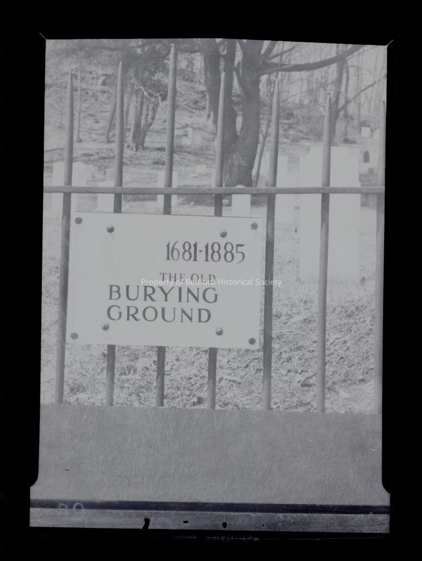 B & W photo of old burying ground old sign, unknown date