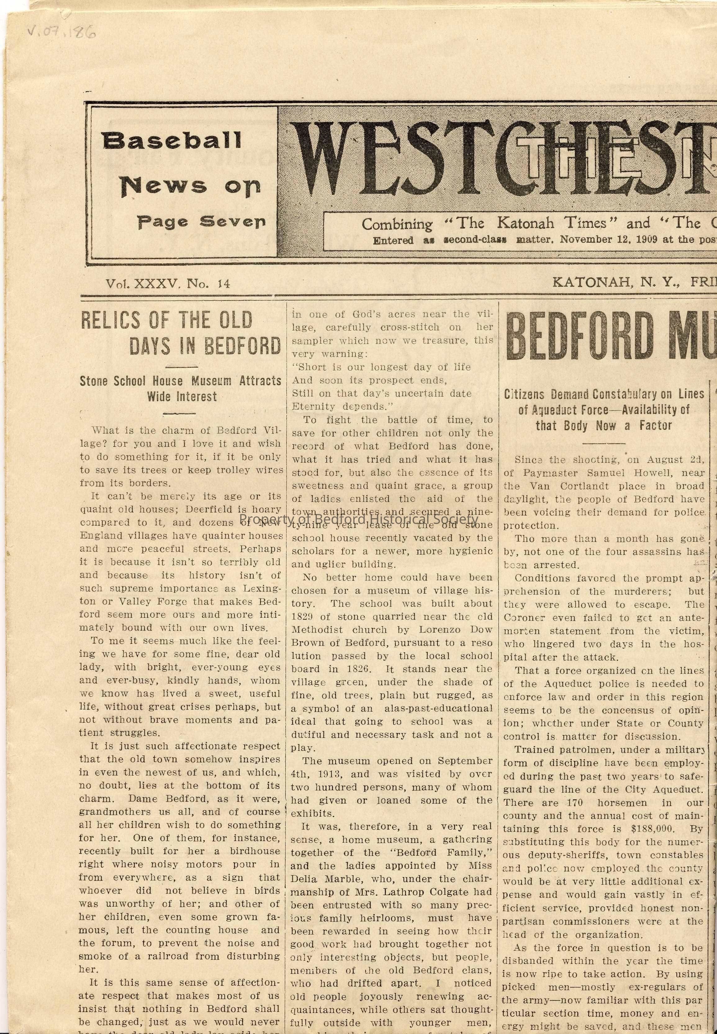 North Westchester Times, article about the opening of the Bedford Museum, September 12, 1913