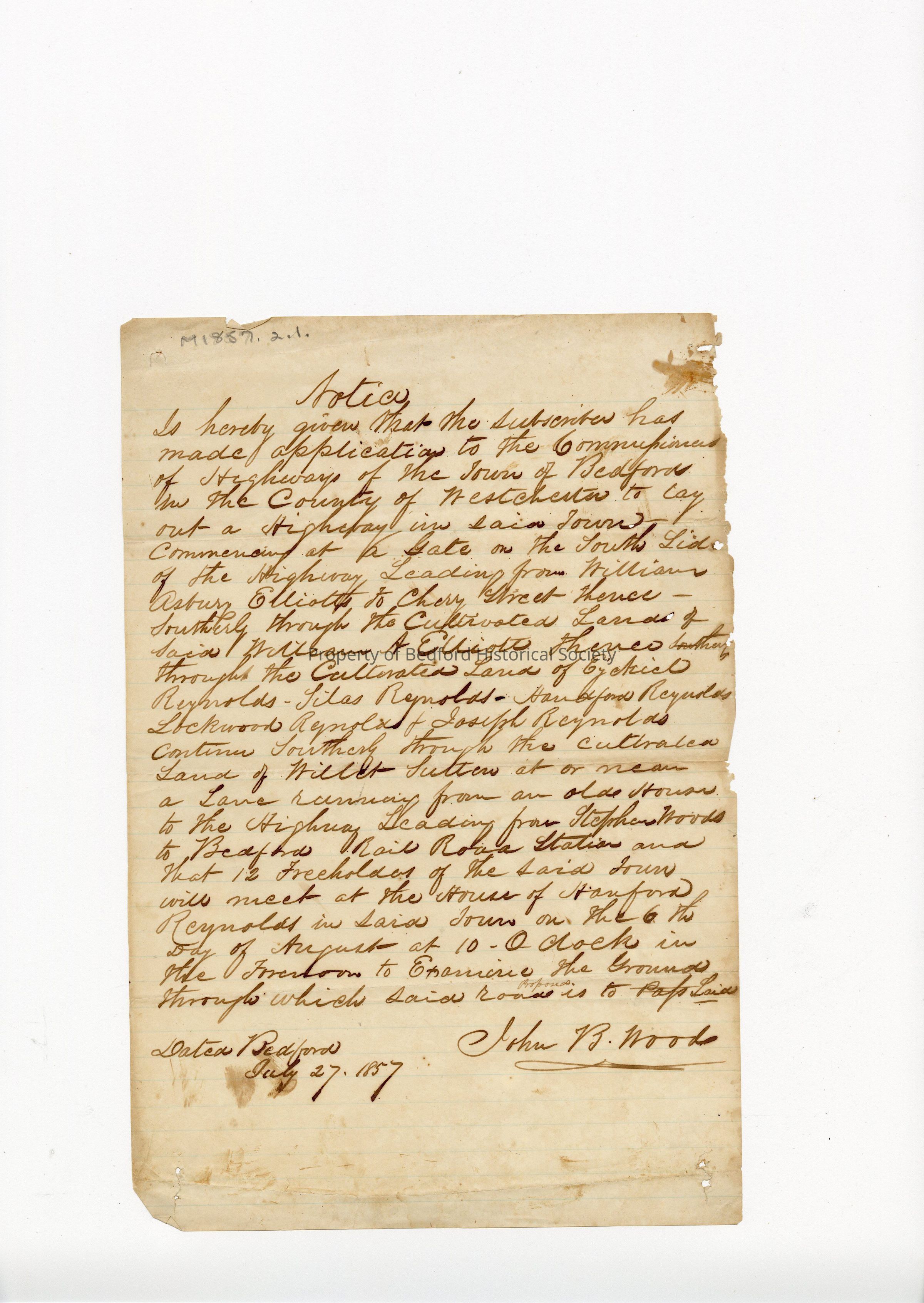 Notice by John B. Wood of proposed highway, July 27th, 1857