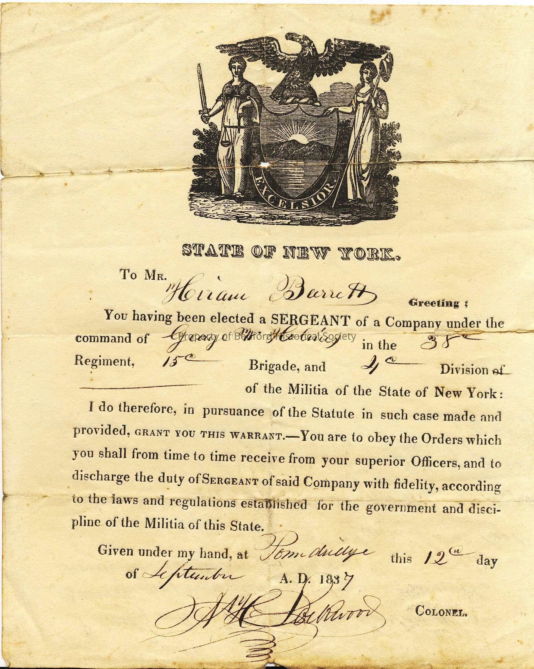 Notice of election to Sergeant for Hiram Barrett in the New York State Militia, Sept. 12, 1837