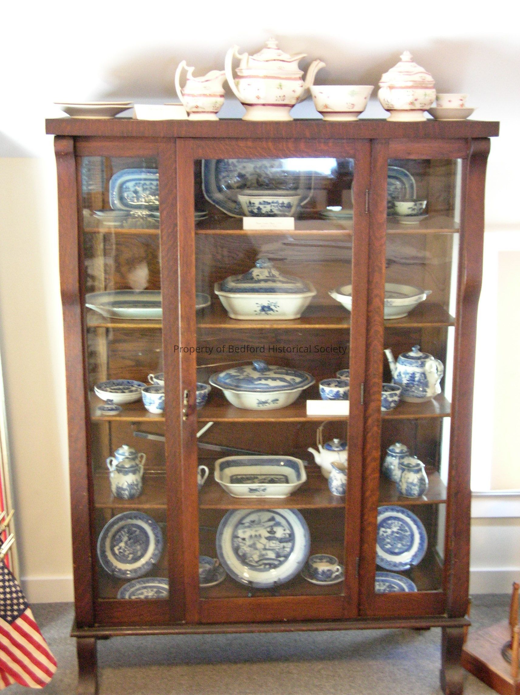 Oak china cabinet. Center glazed door, flanked by two (2) straight glass panels, straight glass panel sides, "scrolled" front legs. Early 20th century, 60 1/2" tall x 42"wide.