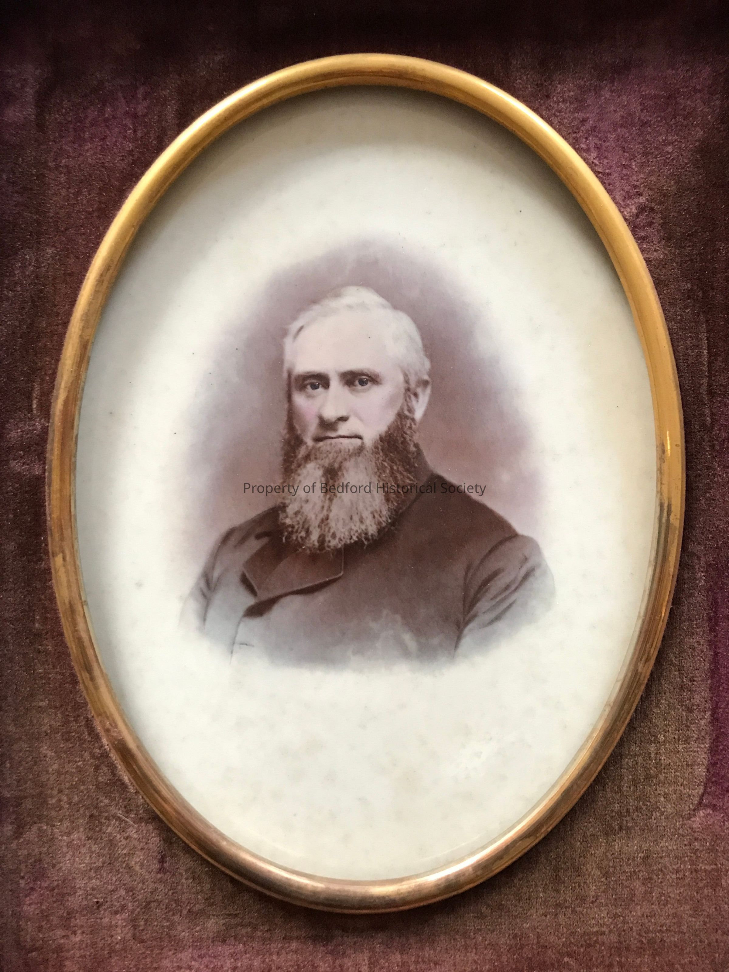 Framed oval opaltype (printed on milk glass) of Arnell Dickinson, first president pf Bedford Farmer's Club 10" L, 8" W
