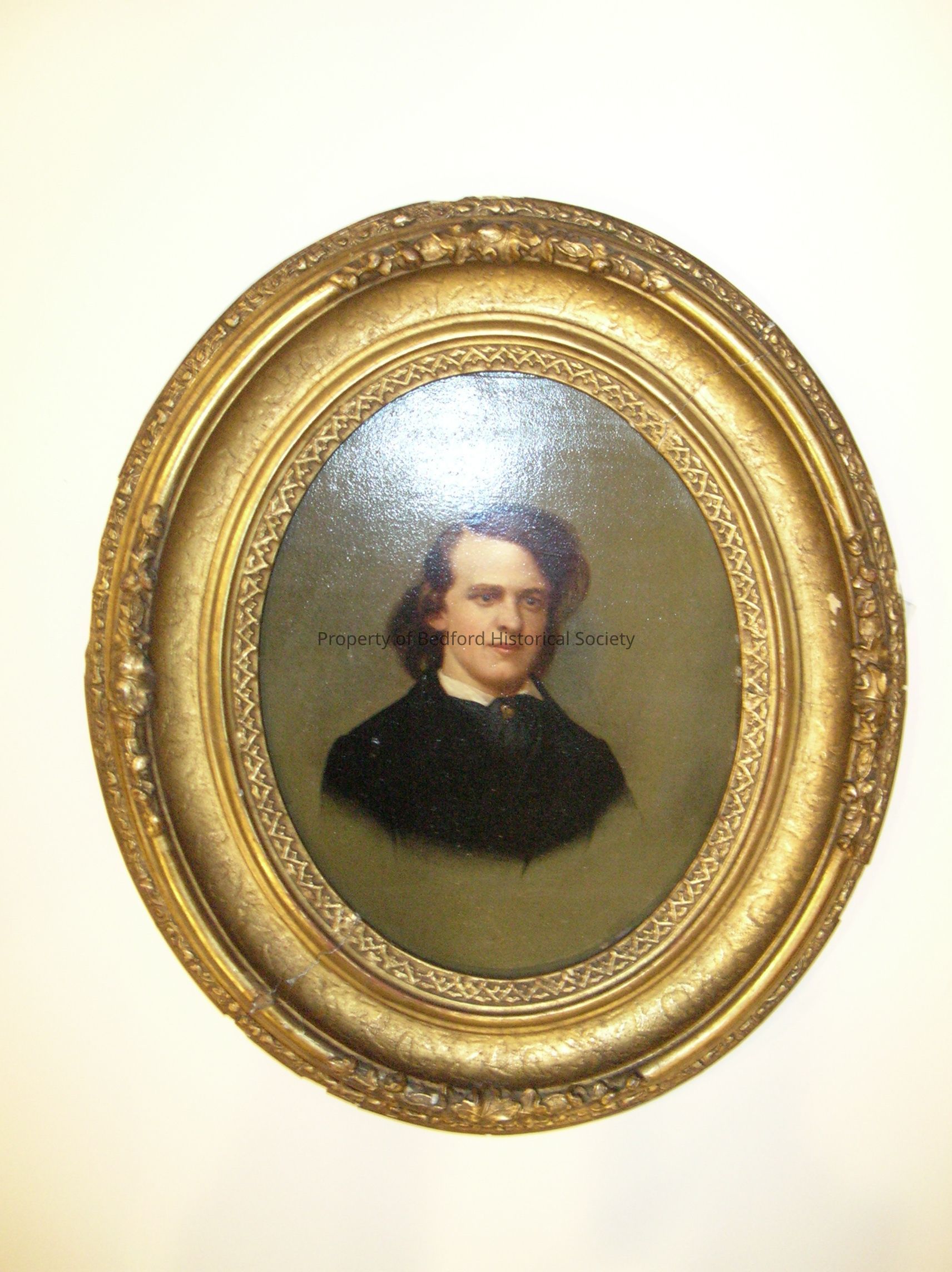 Small oval, oil on board, portrait of young James Husted in a black coat (first school master in Bedford). Painted from early daugerreotype. Mid 19th century, 10" tall, by 8" wide, plus gold like ornate frame. (See item 10 in Appraisal.) Found in School House.
