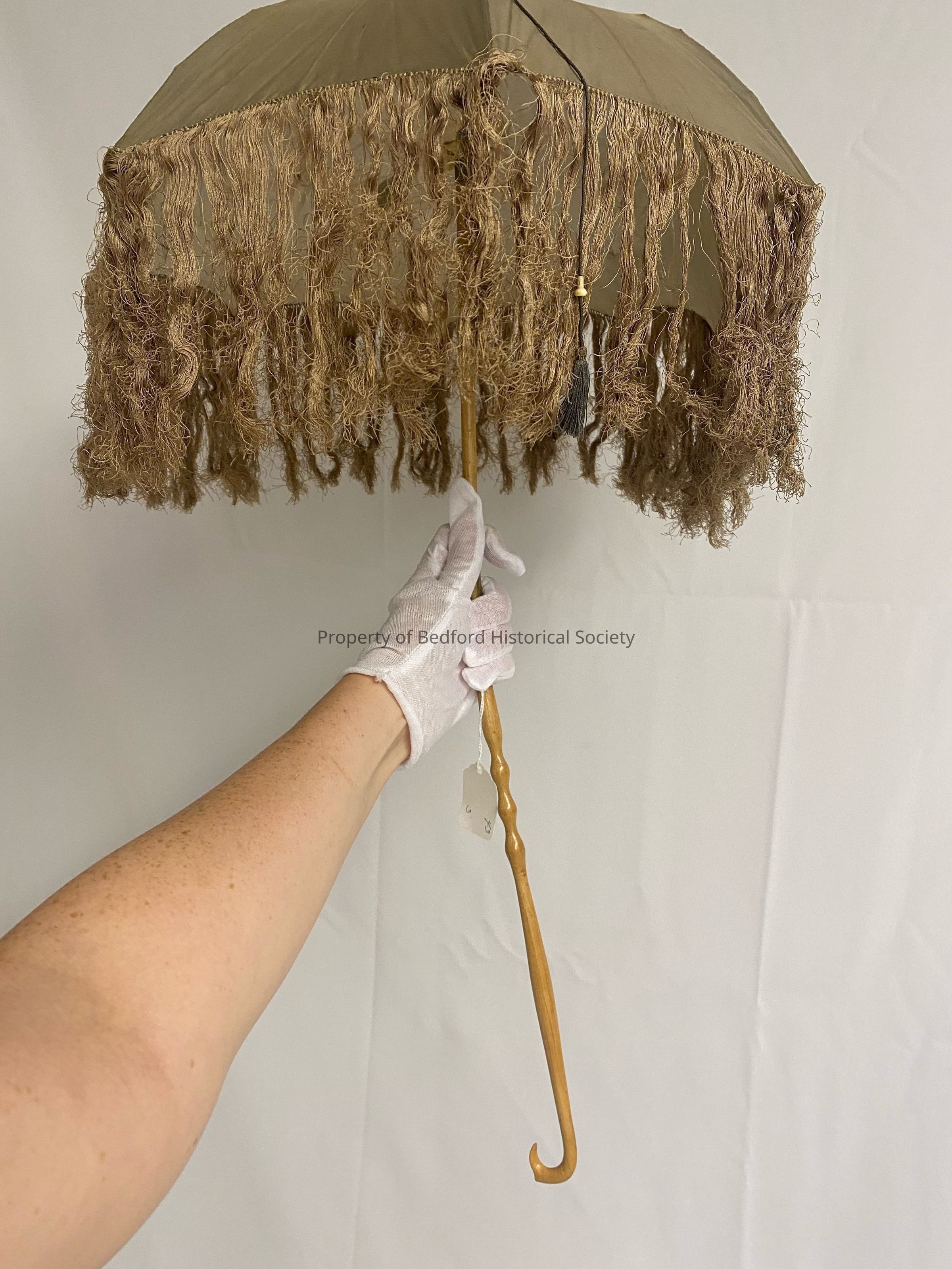 Green silk pagoda parasol with long tan fringe and attached tassle, collapsible wooden crook handle